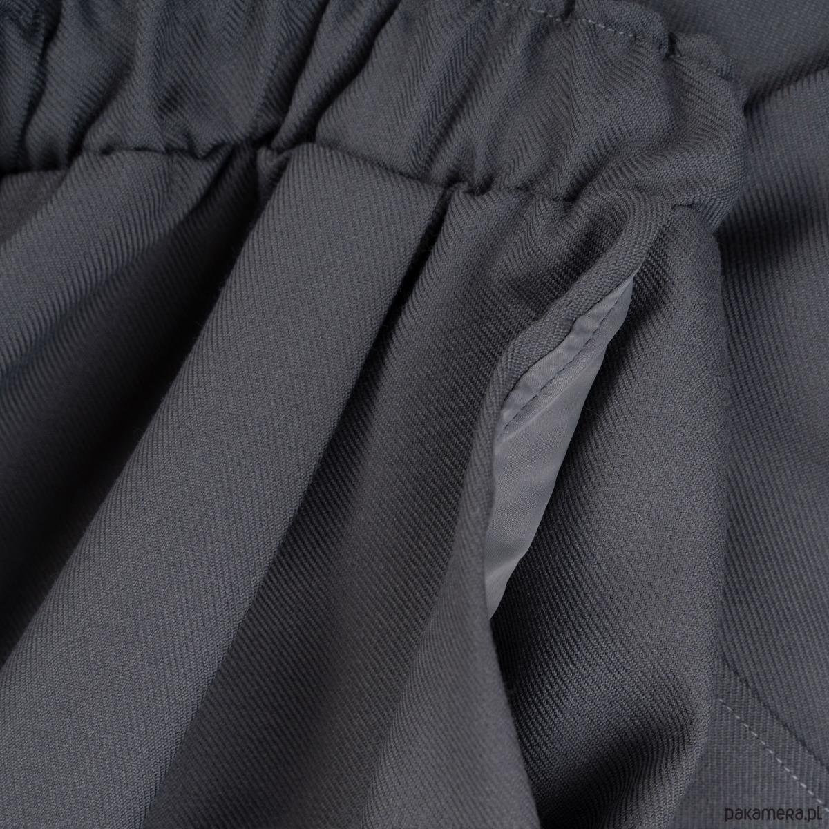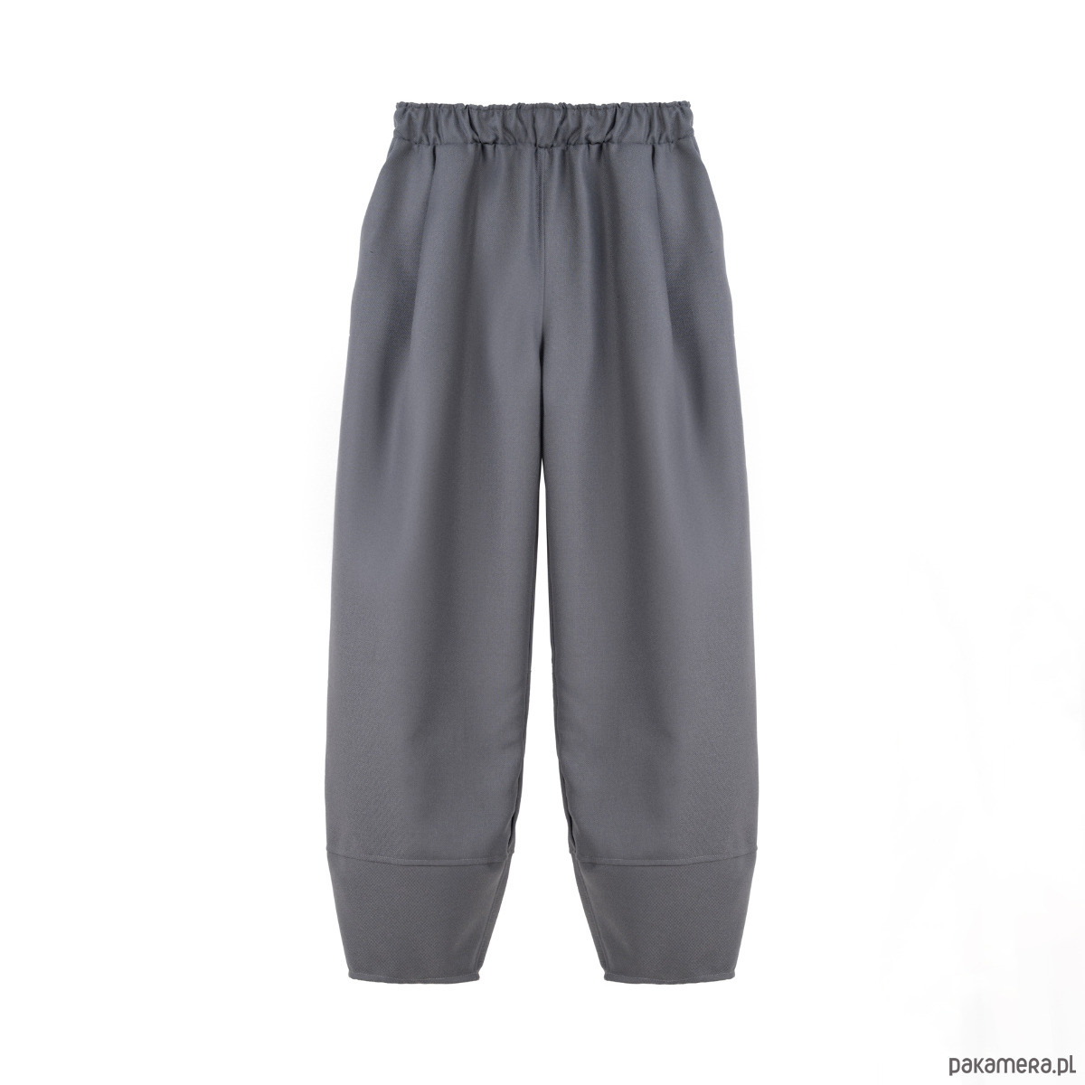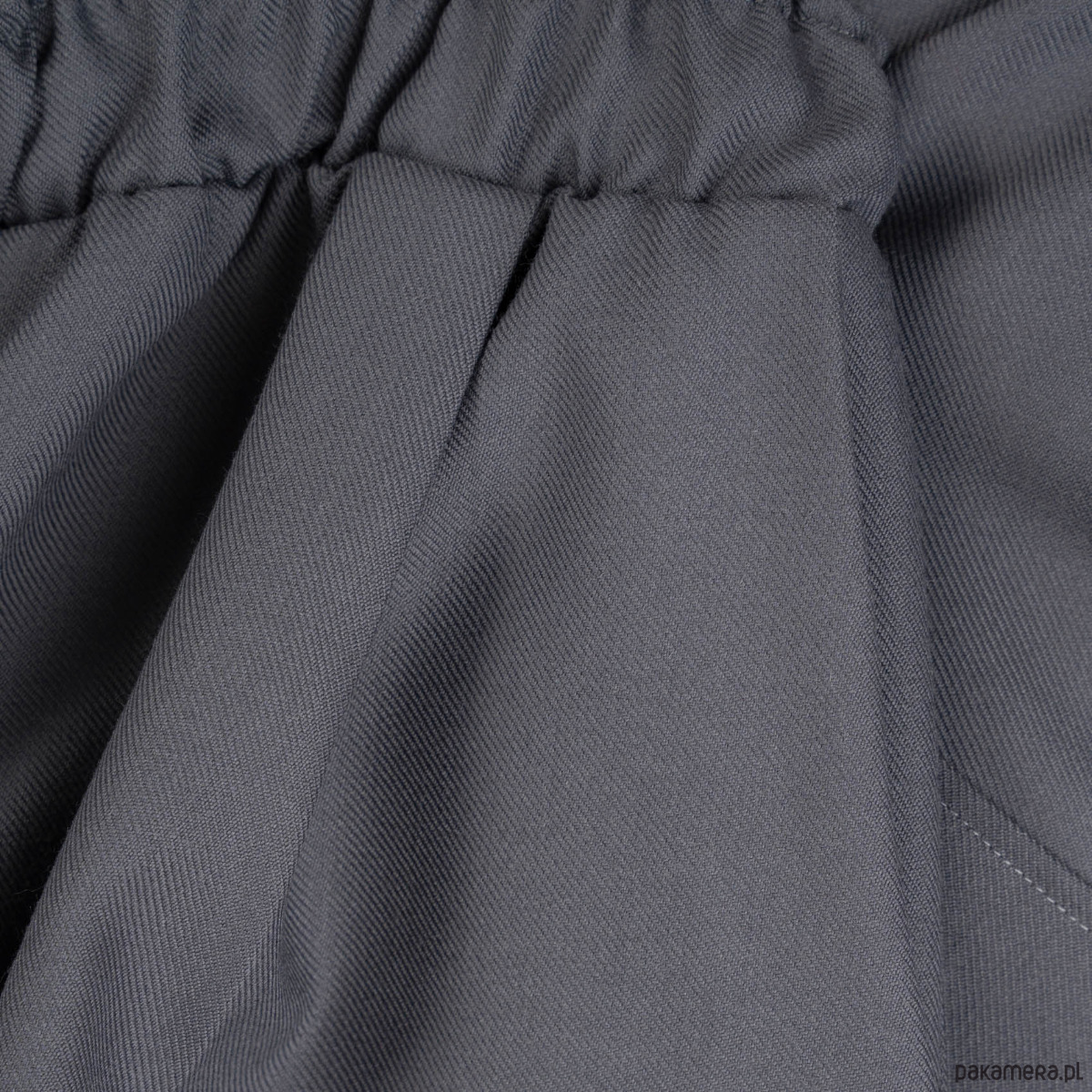Przód spodni urozmaicają symetrycznie rozmieszczone szerokie zaszewki. Po bokach dwie spore i wygodne kieszenie. Góra wykończona szerokim pasem z wszytą wewnątrz gumą. Dół nogawki wykończony jest ciekawym elementem, zamyka je zwężany kielich, który kończy się tuż nad kostką.