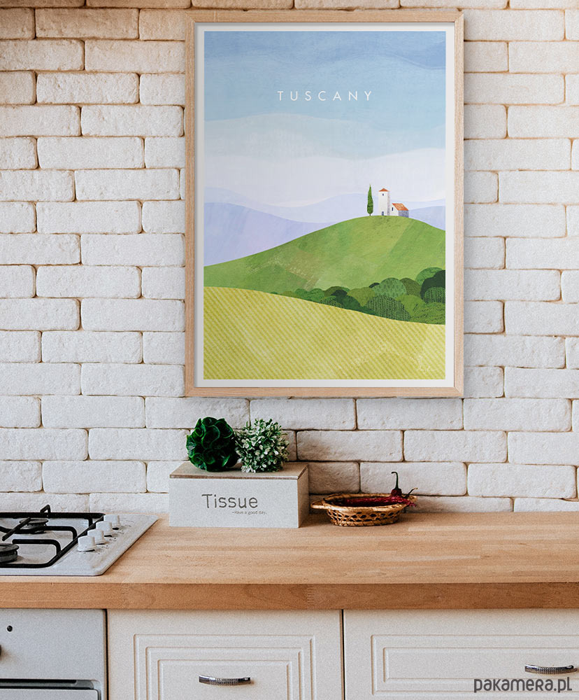 Podróżniczy plakat Toskania z zielonymi, charakterystycznymi dla tego regionu wzgórzami, wypełnia wakacyjna, radosna energia. Autorem plakatu jest brytyjski ilustrator Henry Rivers. Sprawdź inne plakaty z tej serii i stwórz swoją wyjątkową galerię.
