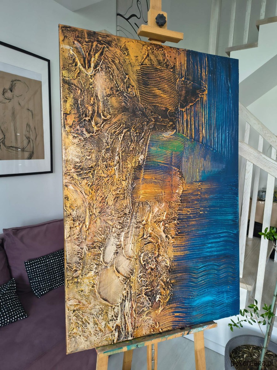 Tworzymy obrazy malowane ręcznie na grubych, galeryjnych podobraziach malarskich autorską, wypracowaną przez lata techniką strukturalną.