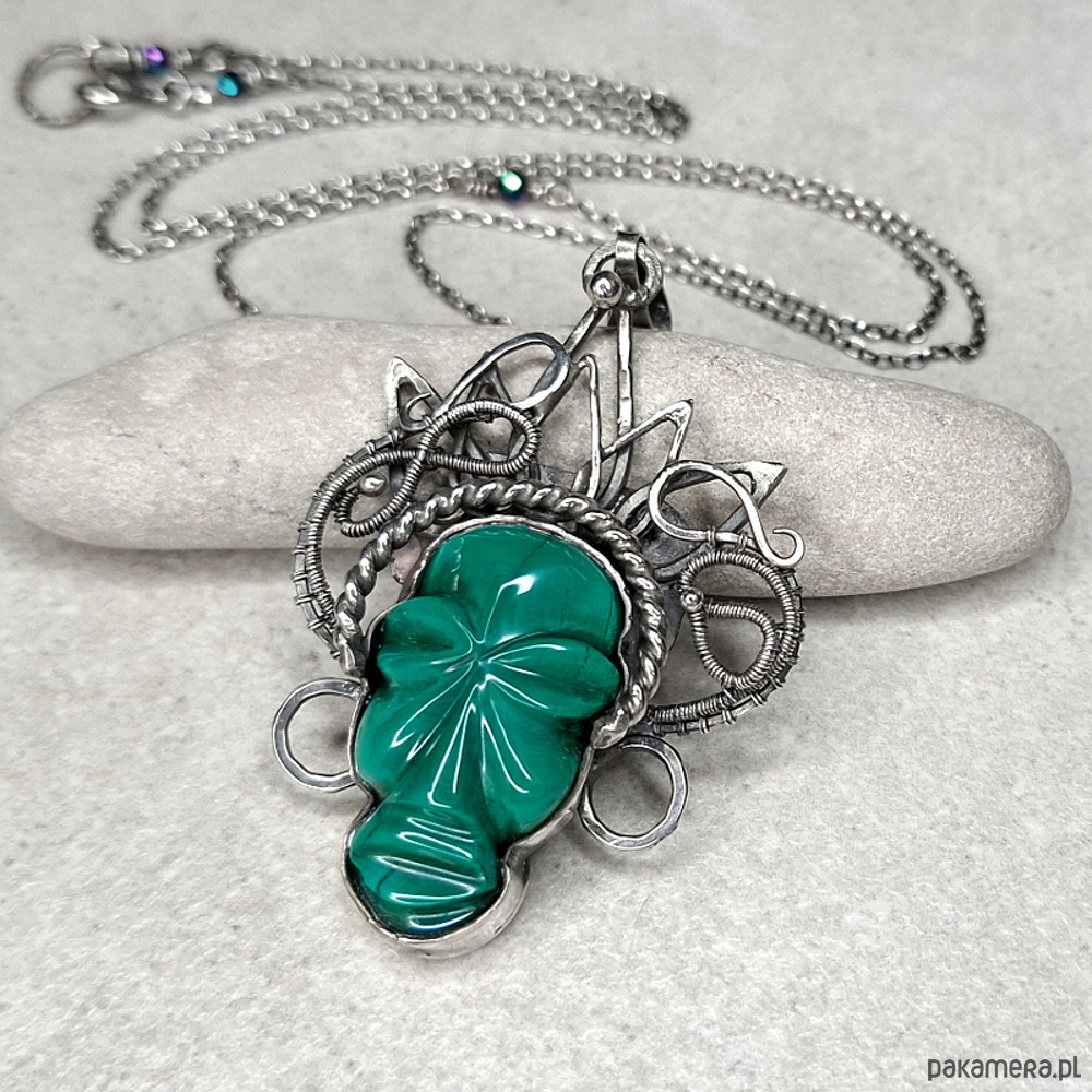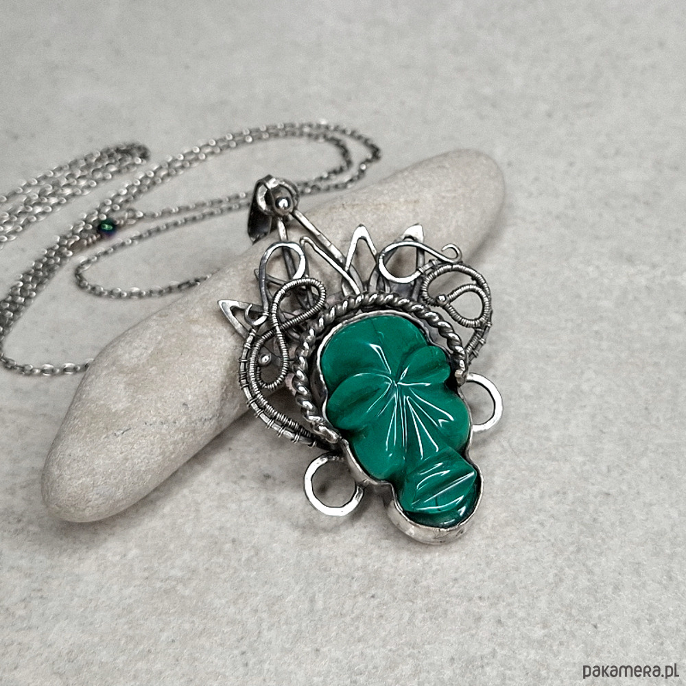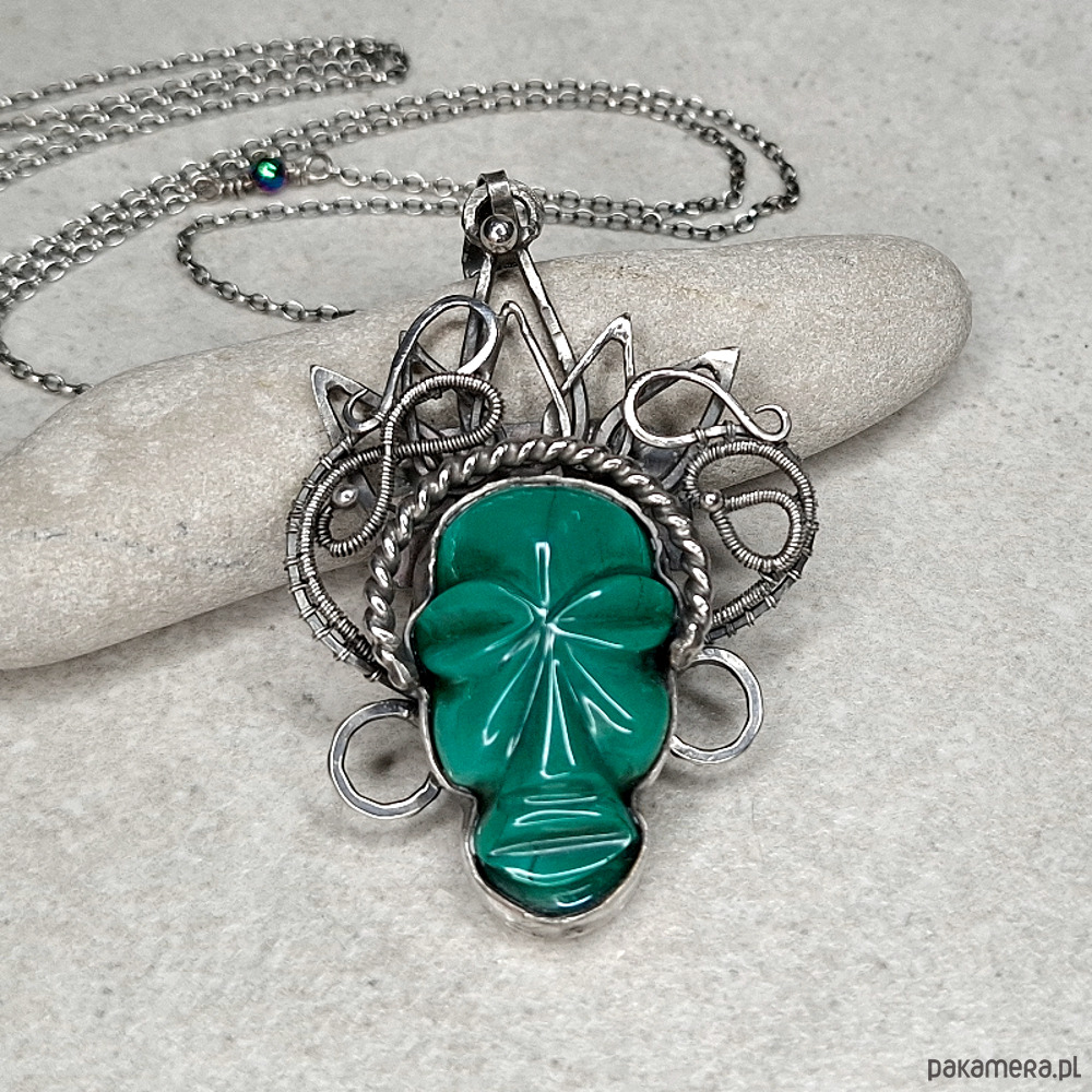 Srebrny naszyjnik z maską rzeźbioną w malachicie, wykonany w całości ręcznie. Wisior naszyjnika został wykonany ze srebra próby 925, 930 i 999. Centralny element w postaci kamiennej maski w kolorze zielonym oplatają srebrne ręcznie kształtowane pasma tworzące plemienny pióropusz, naszyjnik został wykonany w taki sposób aby obie strony biżuterii były ozdobne. Wisior zawiesiłam na srebrnym łańcuszku typu rollo ozdobionym kuleczkami tęczowego hematytu. Wymiary zawieszki w najszerszym miejscu: ok. 39x55 mm, długość zawieszki z krawatką 67mm, długość naszyjnika z zapięciem ok 66cm. Naszyjnik został mocno zoksydowany i wypolerowany. Biżuteria zostanie ozdobnie zapakowana.