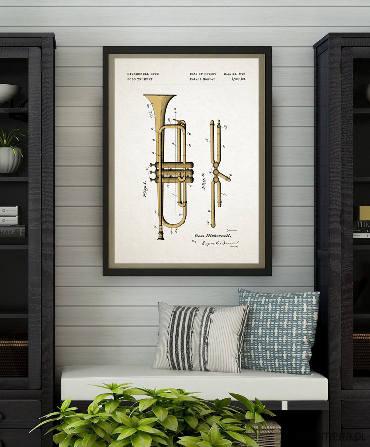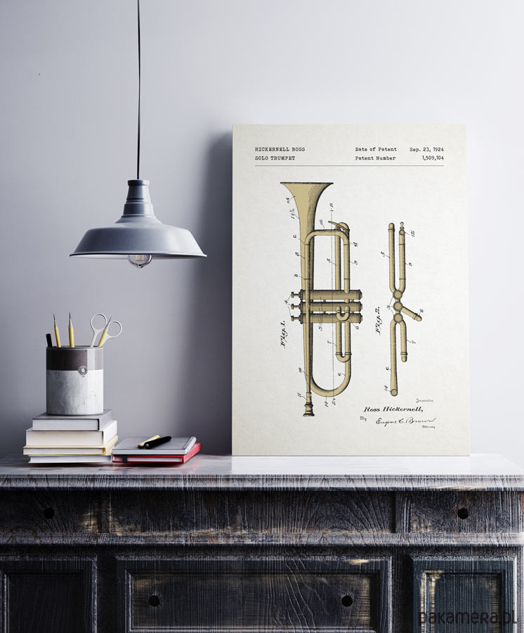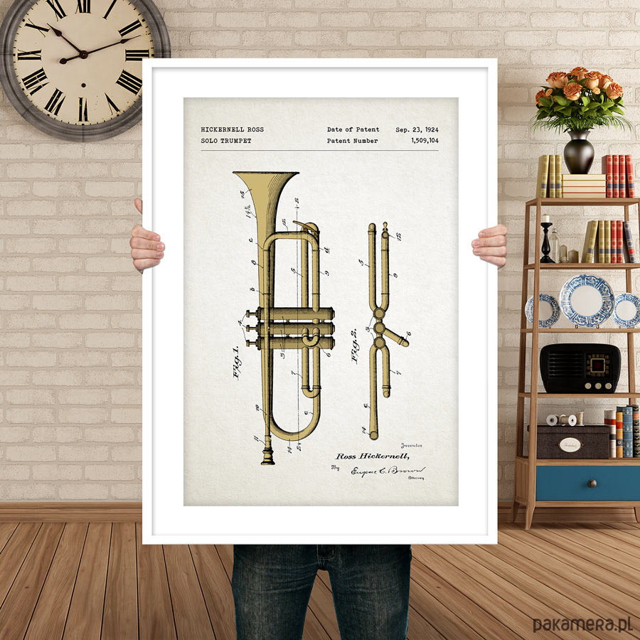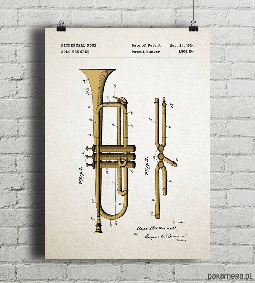 Plakat z reprodukcją patentu na trąbkę, autorstwa Hicknernella Rossa. Patent o numerze 1,509,104 został udzielony w 1924 roku przez Urząd Patentów i Znaków Towarowych Stanów Zjednoczonych.