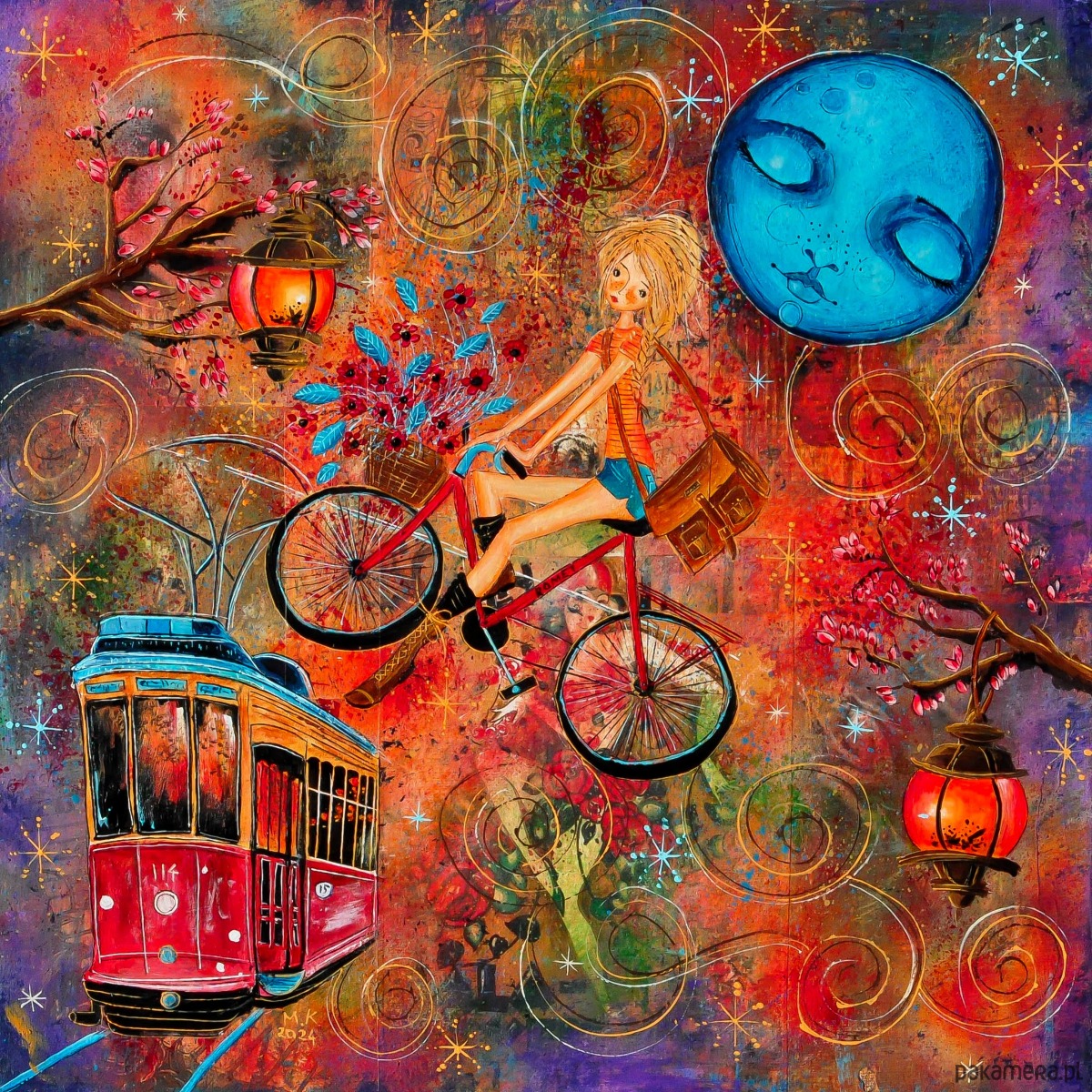 "Tramwaj z Koriyamy" - akryle i kolaż na płótnie. Wystawiony przedmiot to wydruk na płótnie naciągniętym na drewnianą ramę, gotowy do powieszenia na ścianę.