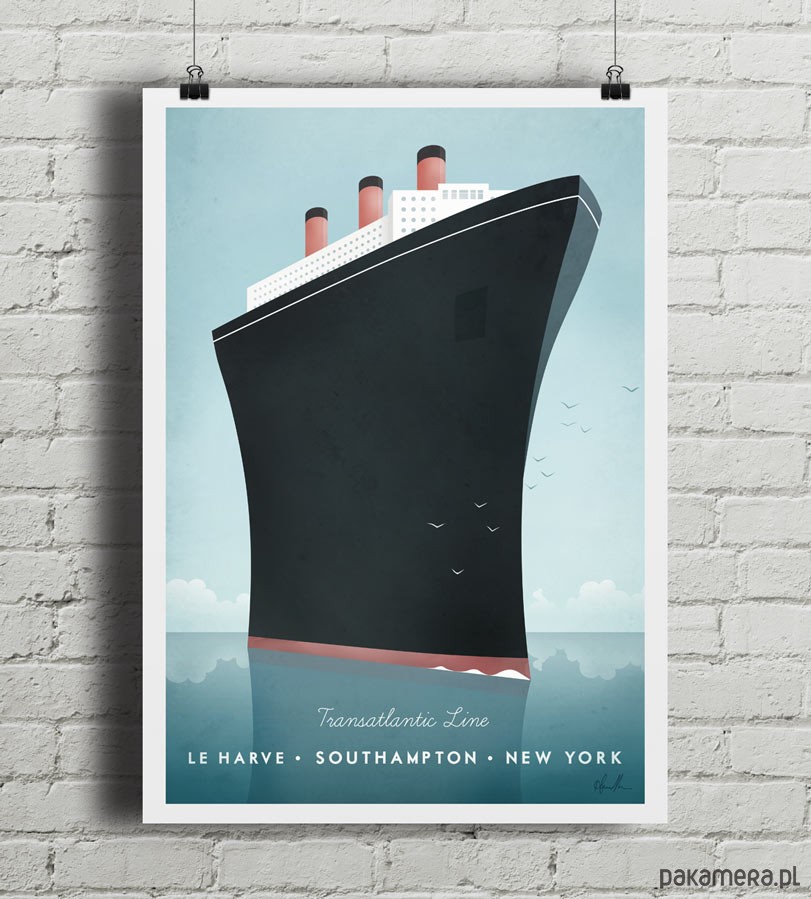 Autorski plakat w stylu vintage przedstawiający transatlantyk SS Normandie (liniowiec pasażerski) podróżujący z Hawru (Francja), poprzez Southampton (Wielka Brytania), do Nowego Jorku (USA). Inspirowany plakatami podróżniczymi z lat 20-tych XX wieku.