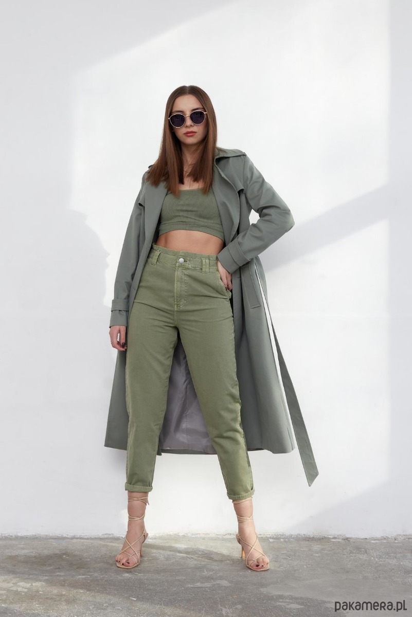 Klasyczny trencz w kolorze zielonym, jest wykonany z włoskiej bawełny. Precyzja jest cechą konieczną do uszycia tego produktu, przez co realizacja jego trwa dużo czasu i wymaga dużego fachu. Trencz zapinany jest na guziki i zawiera pasek, pagony z guzikami na ramionach, wiatrołapy i patki przy rękawach posiada dwie pojemne kieszenie. Ma naturalny skład: 97% co bawełna, 3% elastan. Gramatura bawełny: 480g/mb. Podszewka:100% wiskoza