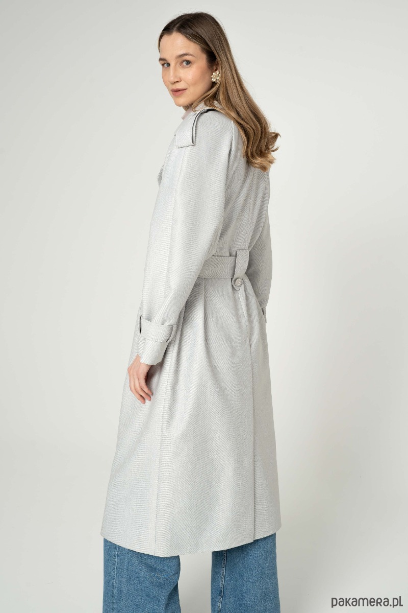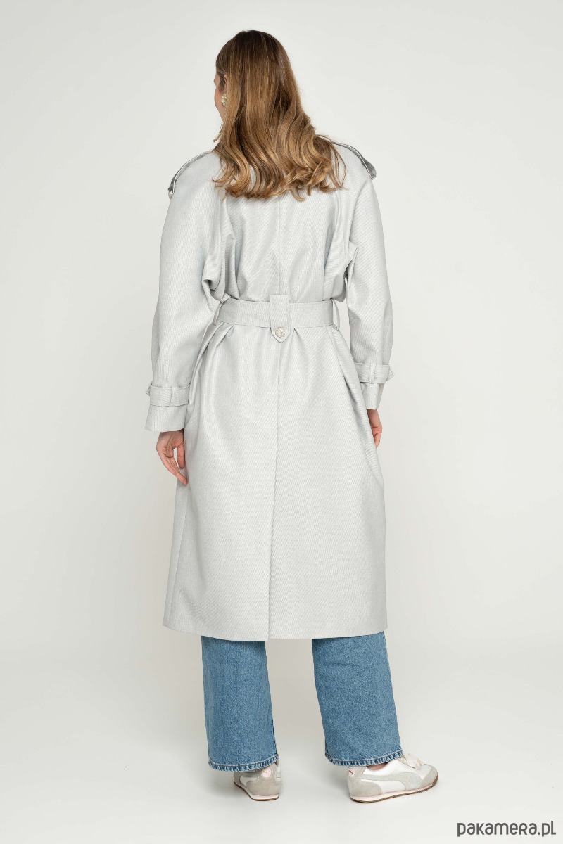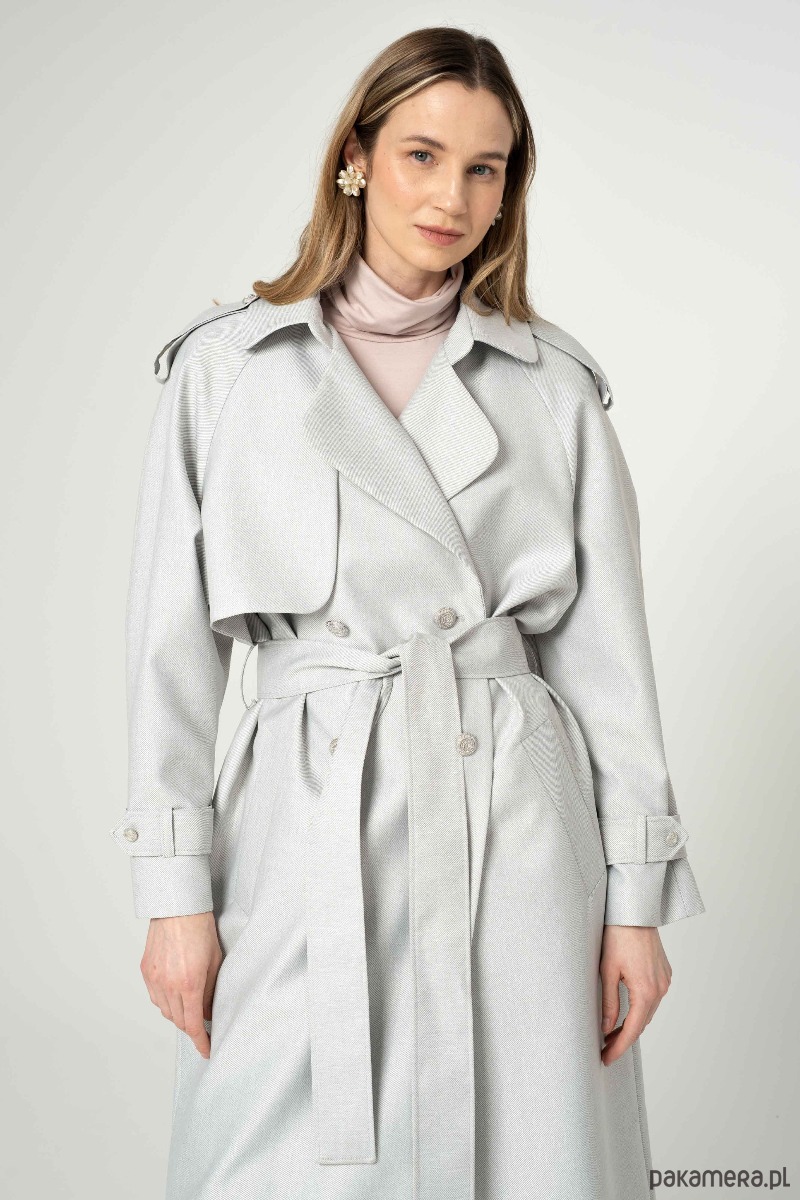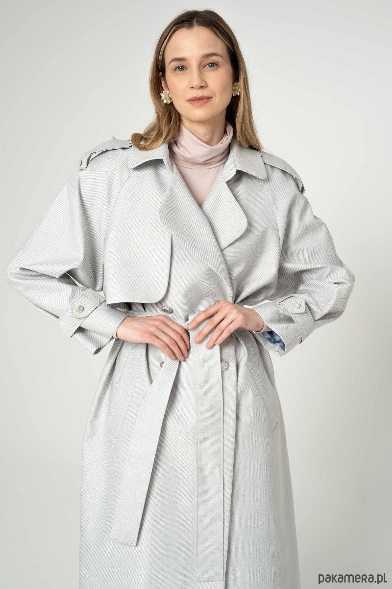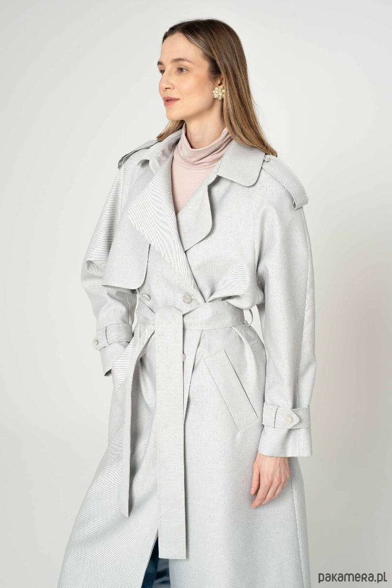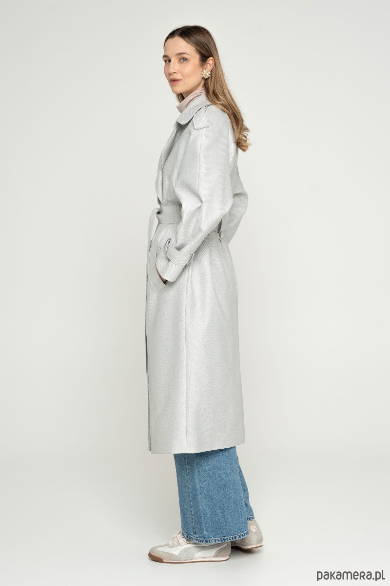 Nowoczesny trencz na bazie konstrukcji z lat 90-tych. Wykonany z bardzo wytrzymałej tkaniny w kolorze srebrnym. Wykończony srebrnymi metalowymi guzikami. Ortalion w prążek o matowym wykończeniu i wiskozowa podszewka. Płaszcz dwurzędowy, przewiązany paskiem.