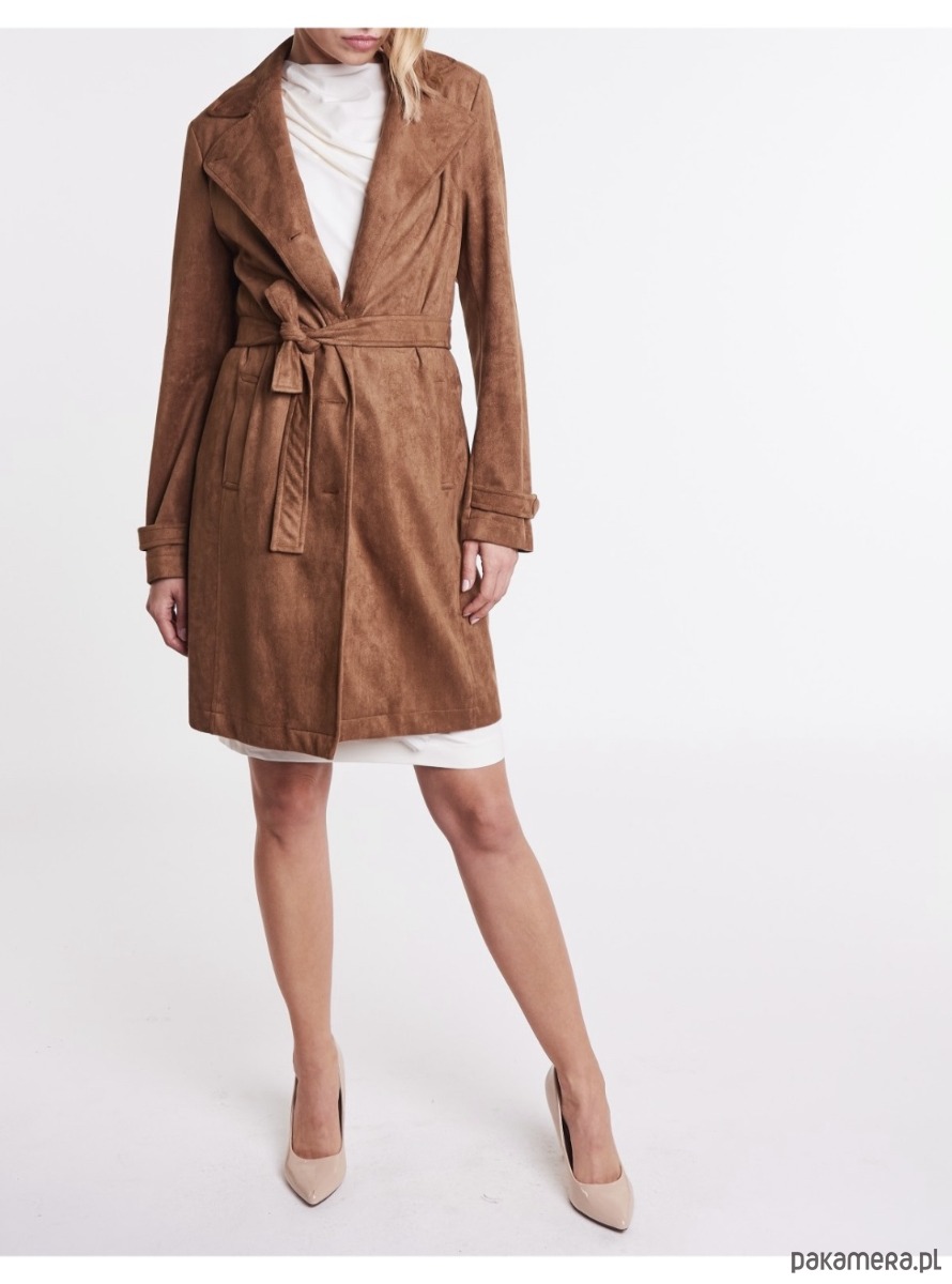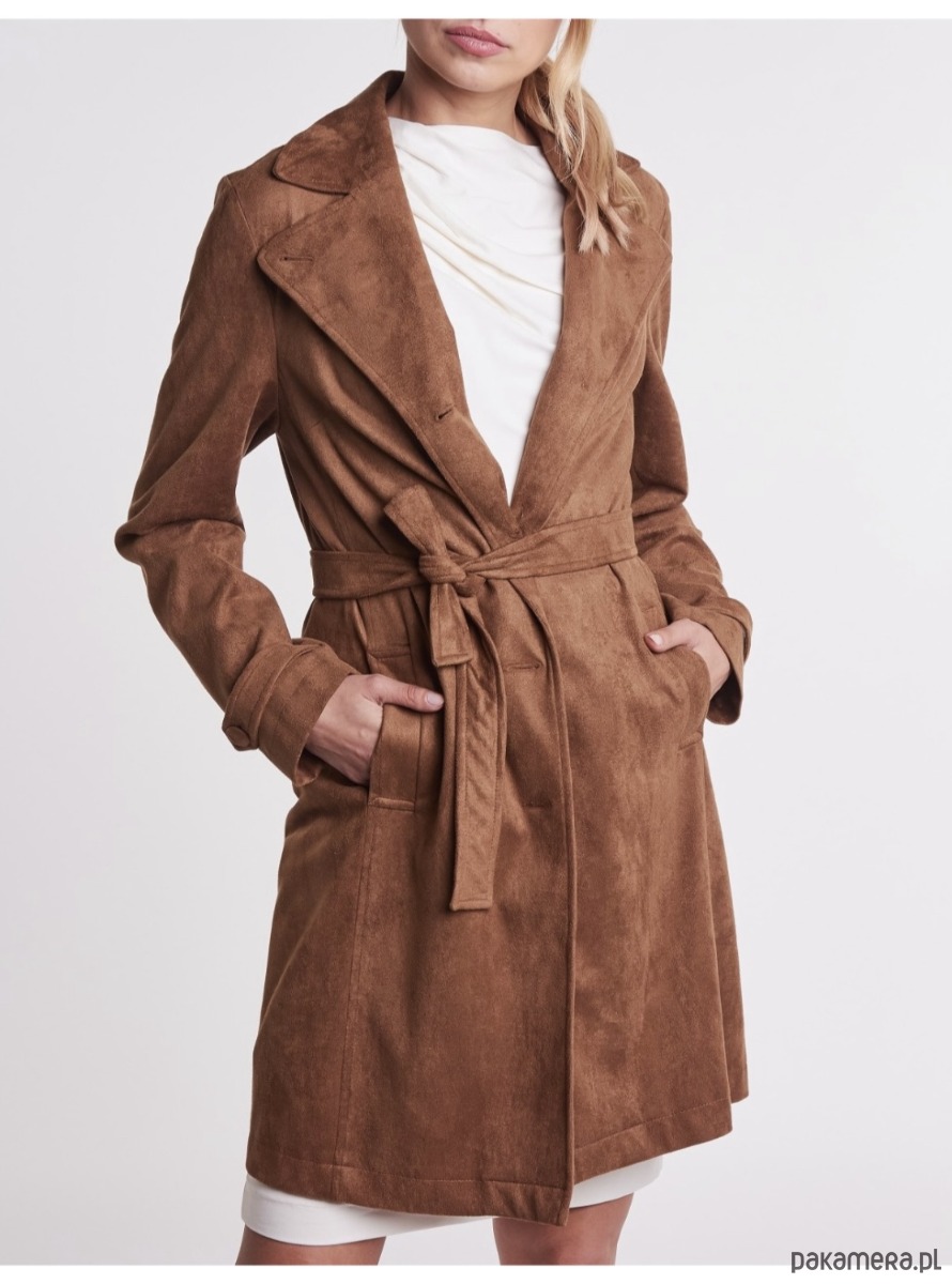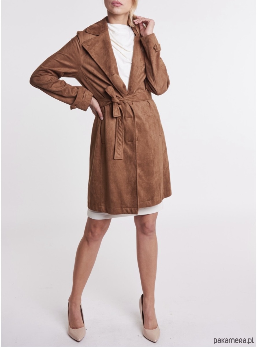 Stylowy minimalistyczny trencz wykonany z miękkiego, dwustronnego zamszu ekologicznego w odcieniu ciepłego orzechowego brązu. Posiada szerokie klapy, wiązanie w pasie oraz guziki w kolorze tkaniny. Model przejściowy, bez podszewki.