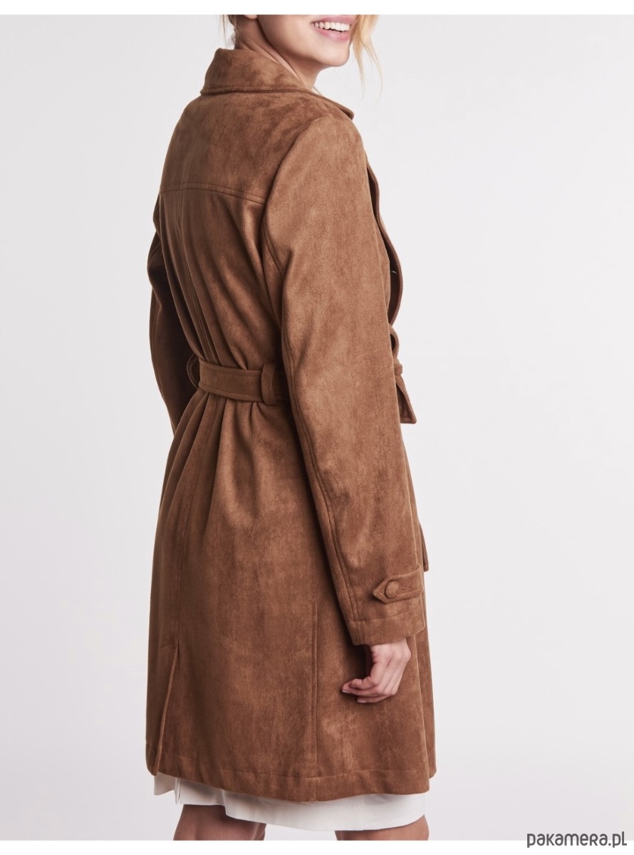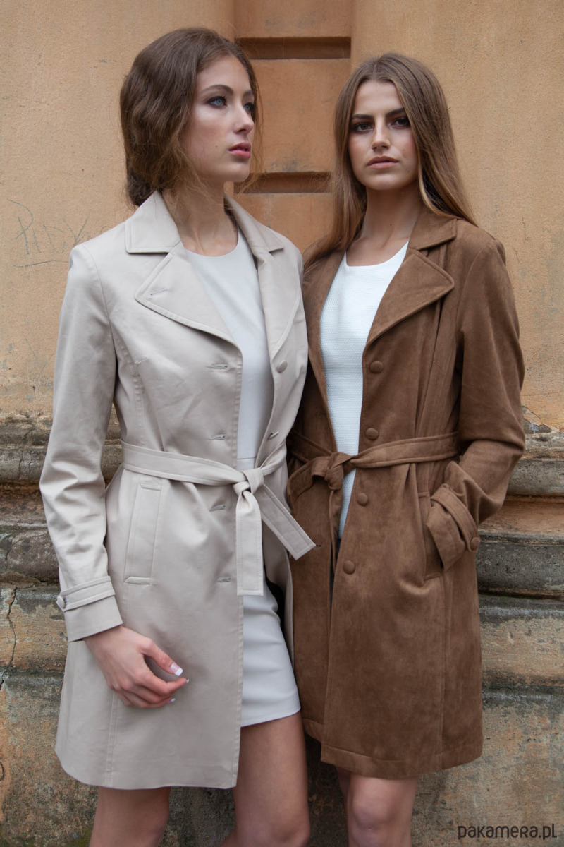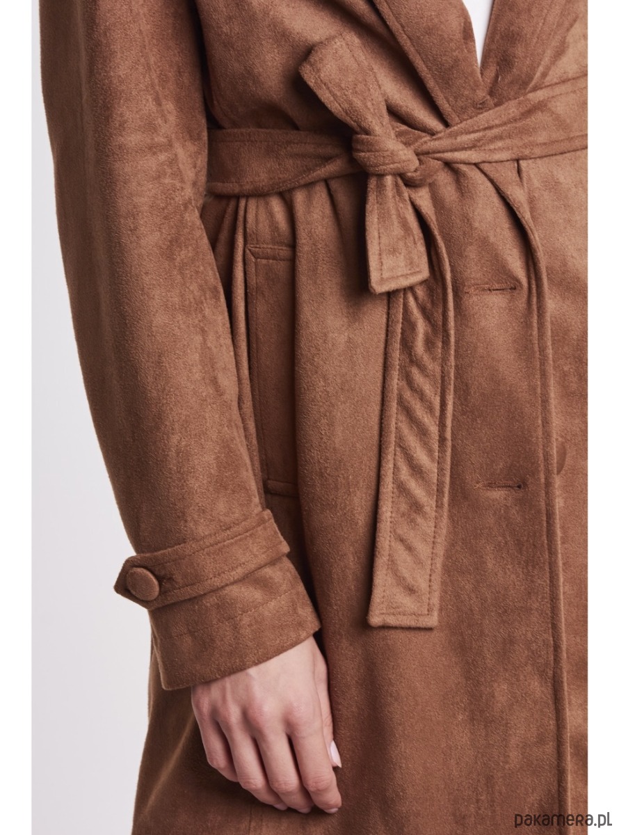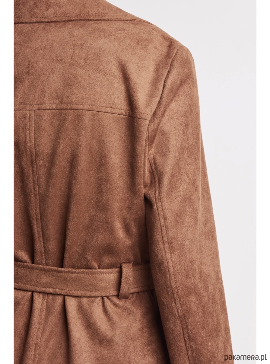Stylowy minimalistyczny trencz wykonany z miękkiego, dwustronnego zamszu ekologicznego w odcieniu ciepłego orzechowego brązu. Posiada szerokie klapy, wiązanie w pasie oraz guziki w kolorze tkaniny. Model przejściowy, bez podszewki.