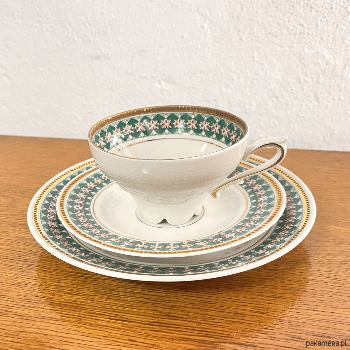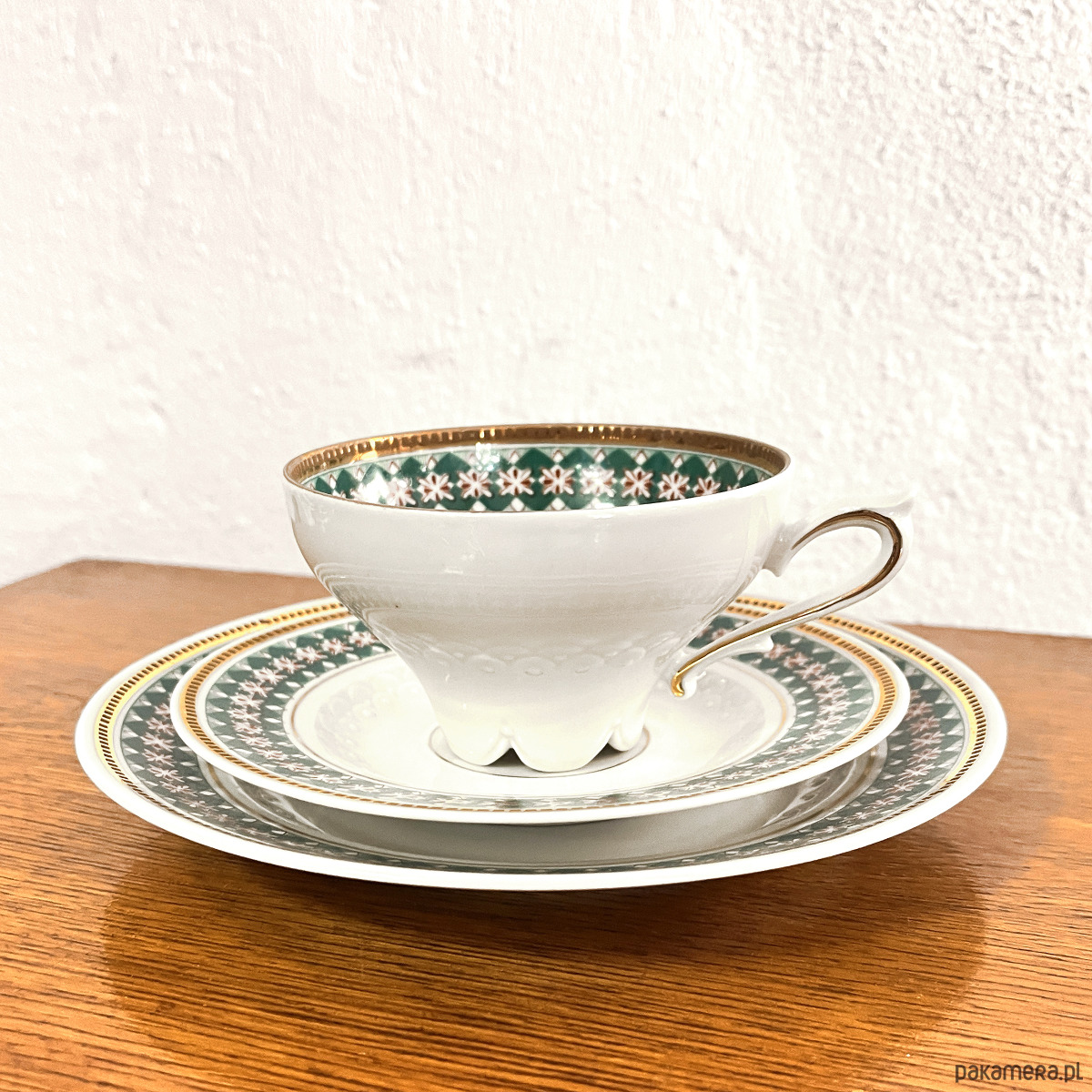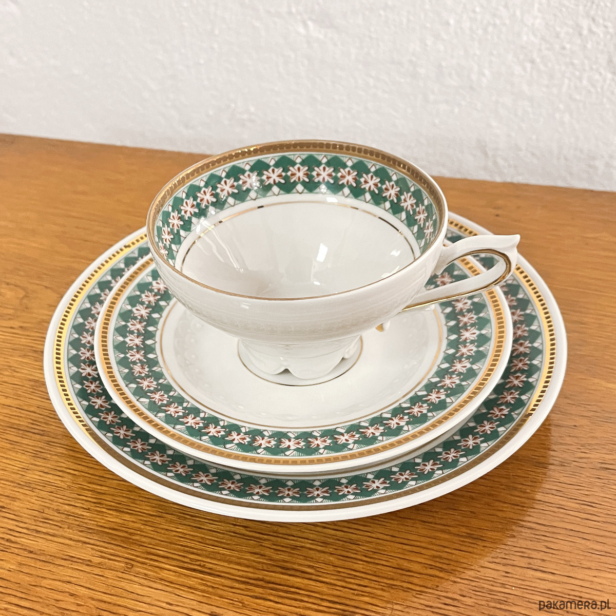 Piękny zestaw śniadaniowy w stylu New Look, (filiżanka+spodek+talerzyk), który pochodzi z Niemiec wschodnich wyprodukowany zostłą przez dla firmy VEB Porzellan Manufaktur Plaue. Piękna, malatura w kolorze ciemnej zieleni z elementami złoconymi. Zaprojektowany w latach 60. ubiegłego wieku. Sygnowany znakiem stosowanym od 1950 do 1973 roku.