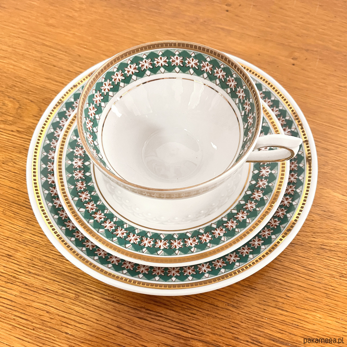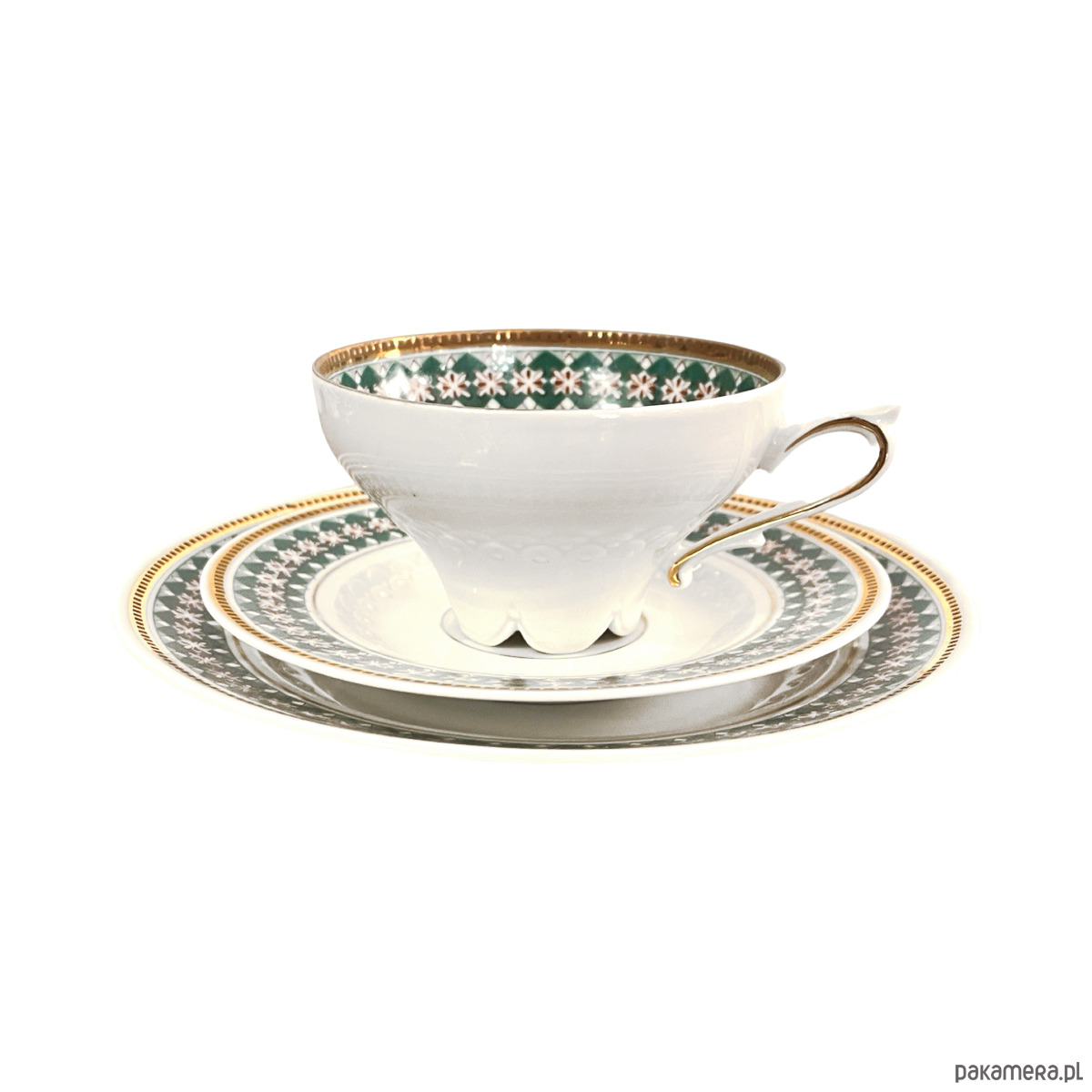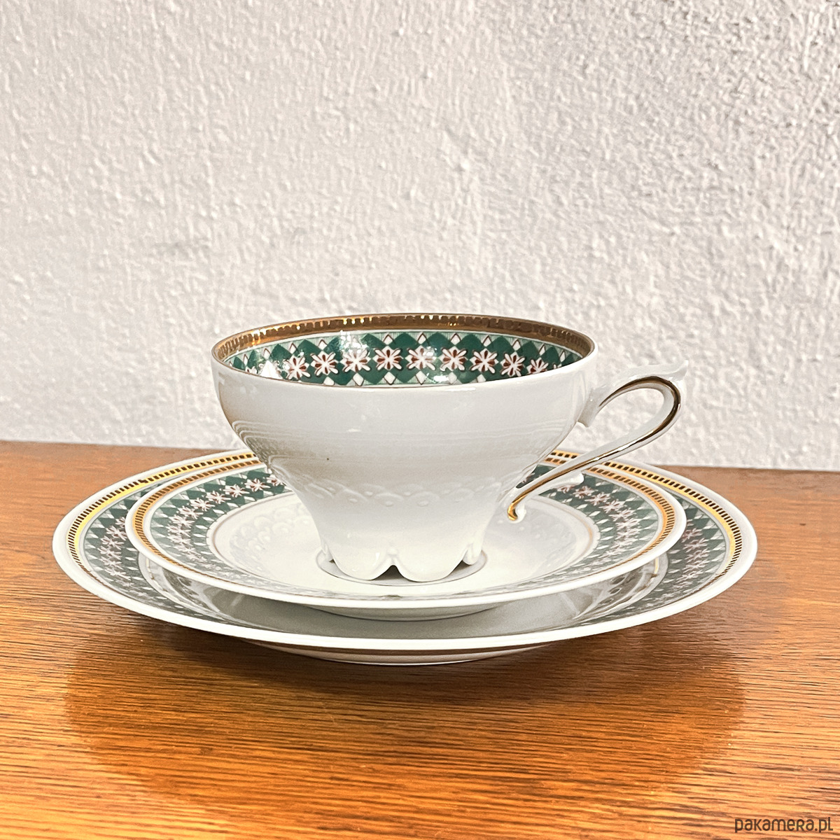 Piękny zestaw śniadaniowy w stylu New Look, (filiżanka+spodek+talerzyk), który pochodzi z Niemiec wschodnich wyprodukowany zostłą przez dla firmy VEB Porzellan Manufaktur Plaue. Piękna, malatura w kolorze ciemnej zieleni z elementami złoconymi. Zaprojektowany w latach 60. ubiegłego wieku. Sygnowany znakiem stosowanym od 1950 do 1973 roku.
