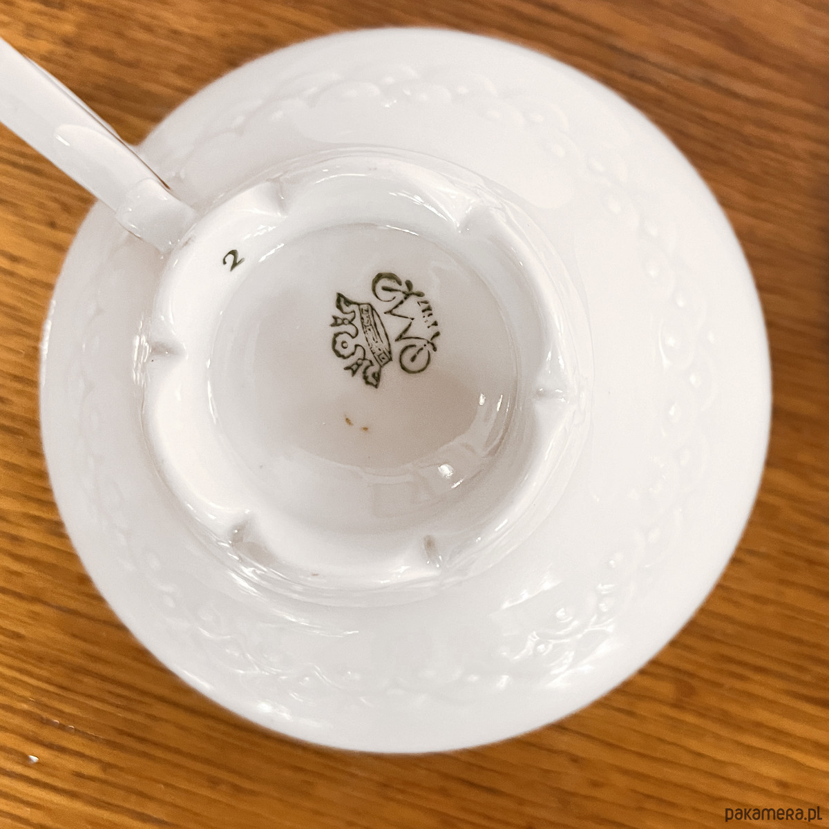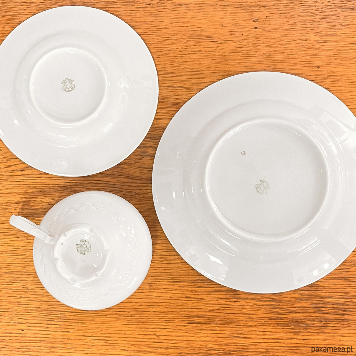 Piękna biała porcelana, o prostym, ascetycznym kształcie. porcelana zdobiona ręcznie malaturą w symetryczny, powtarzający się wzór.