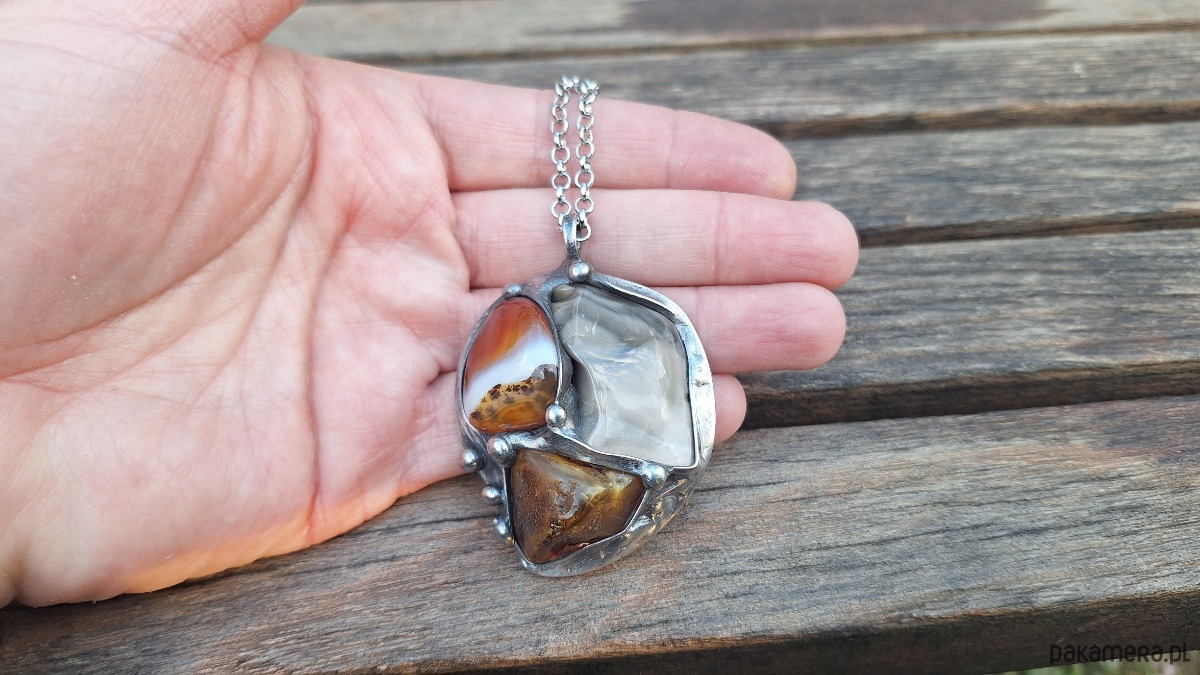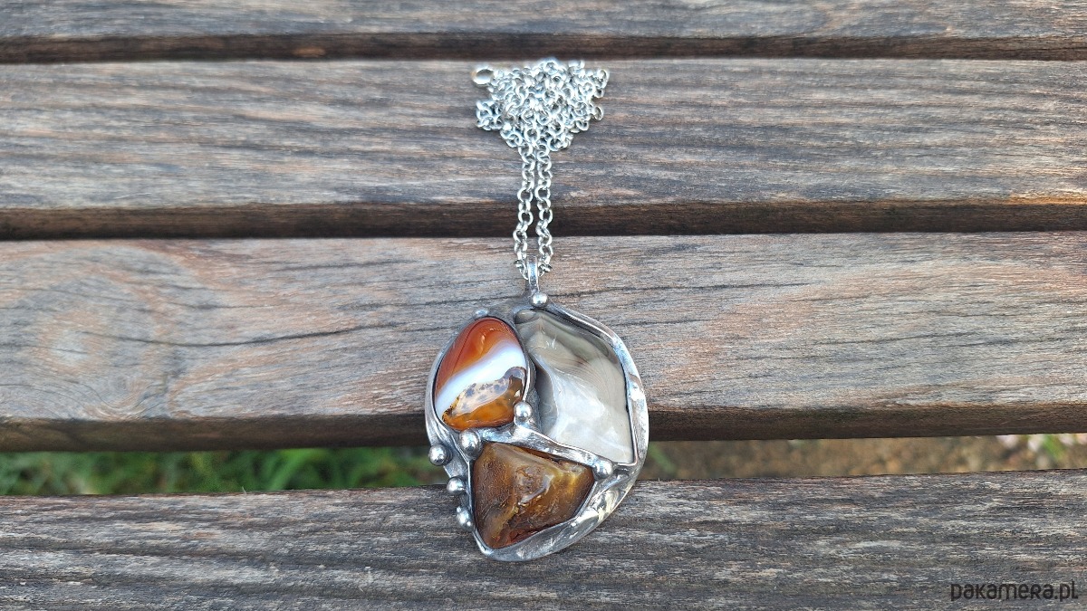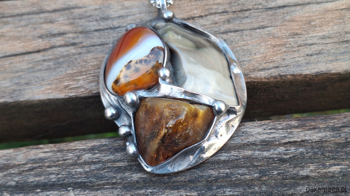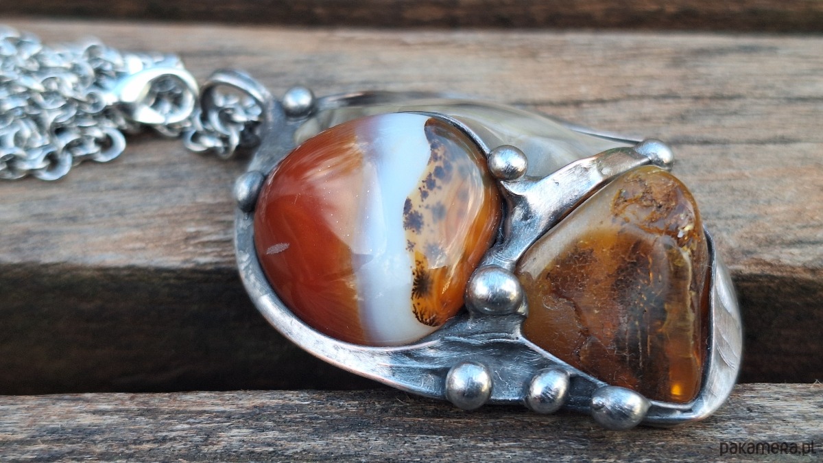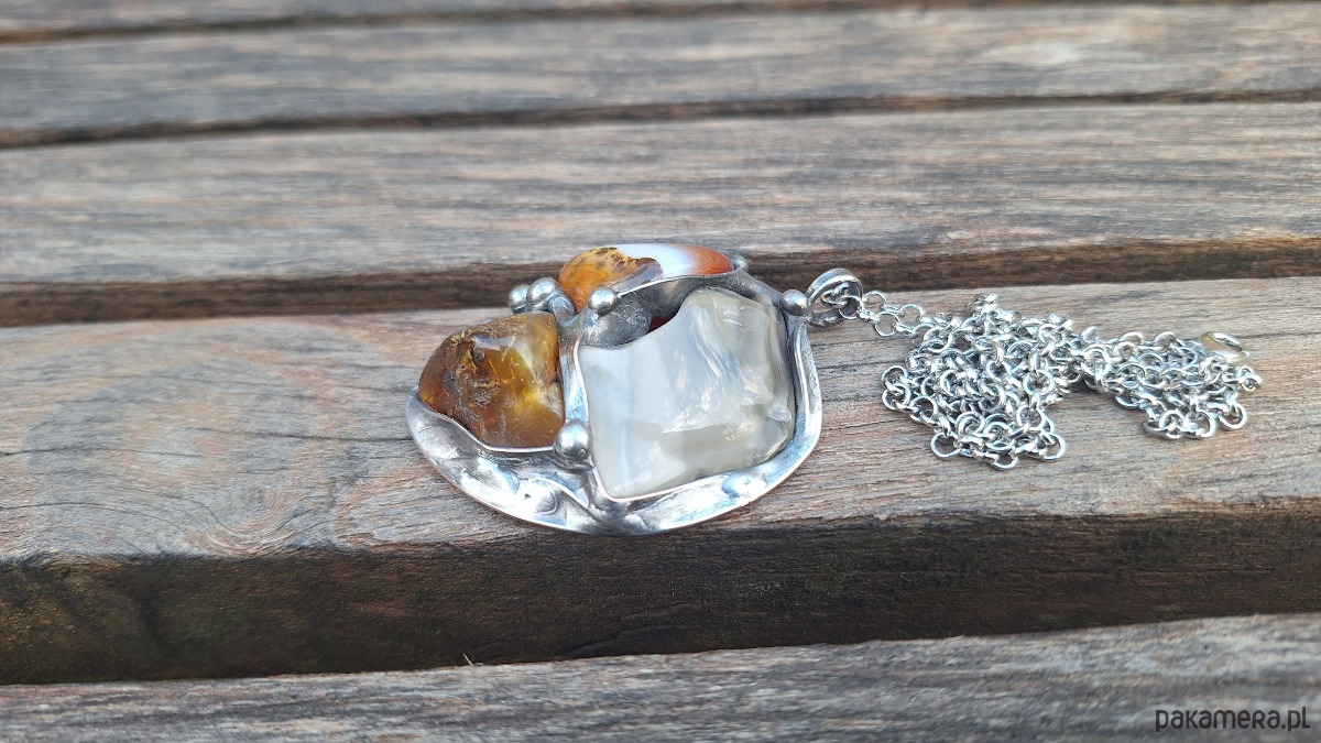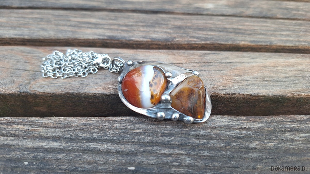 Wisiorek wykonany z miedzi, cyny, krzemienia pasiastego, agatu i bursztynu. Wymiary ok. 5 na 4.3 cm. Zawieszony na łańcuszku o długości ok. 50 cm.