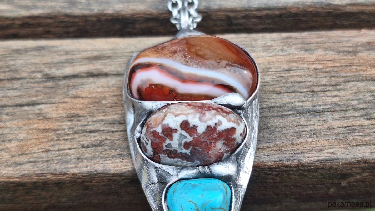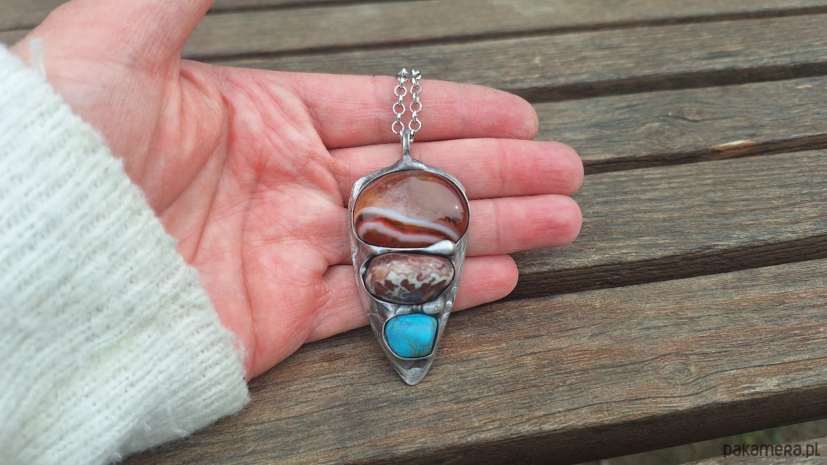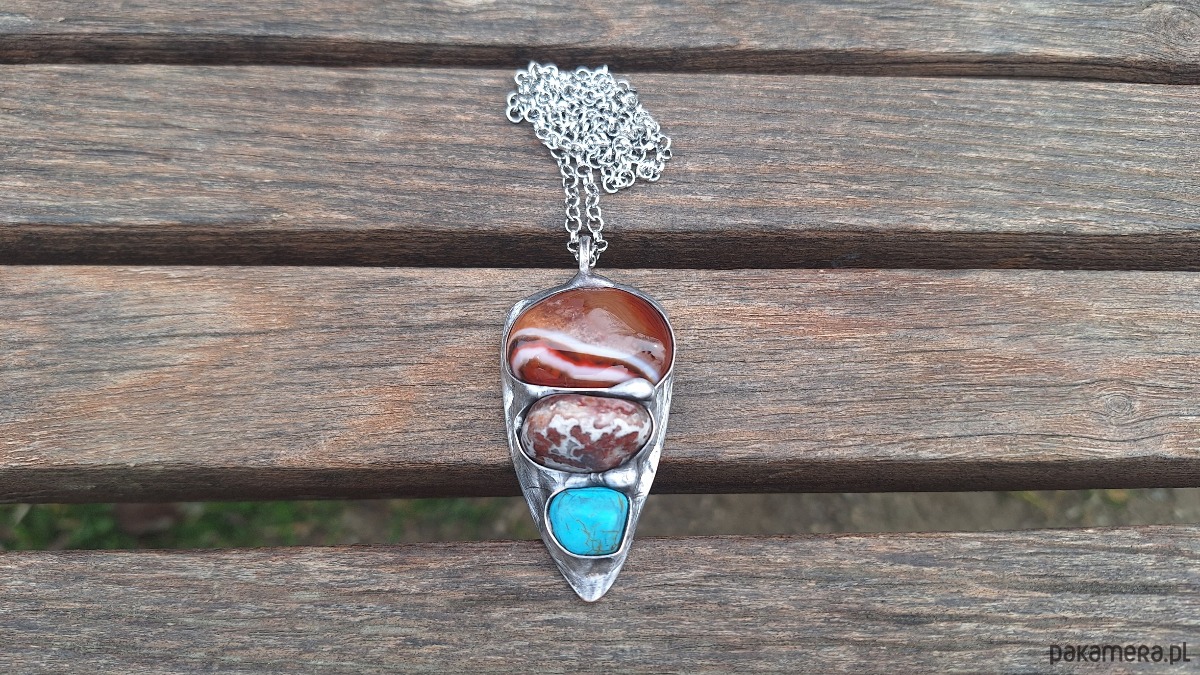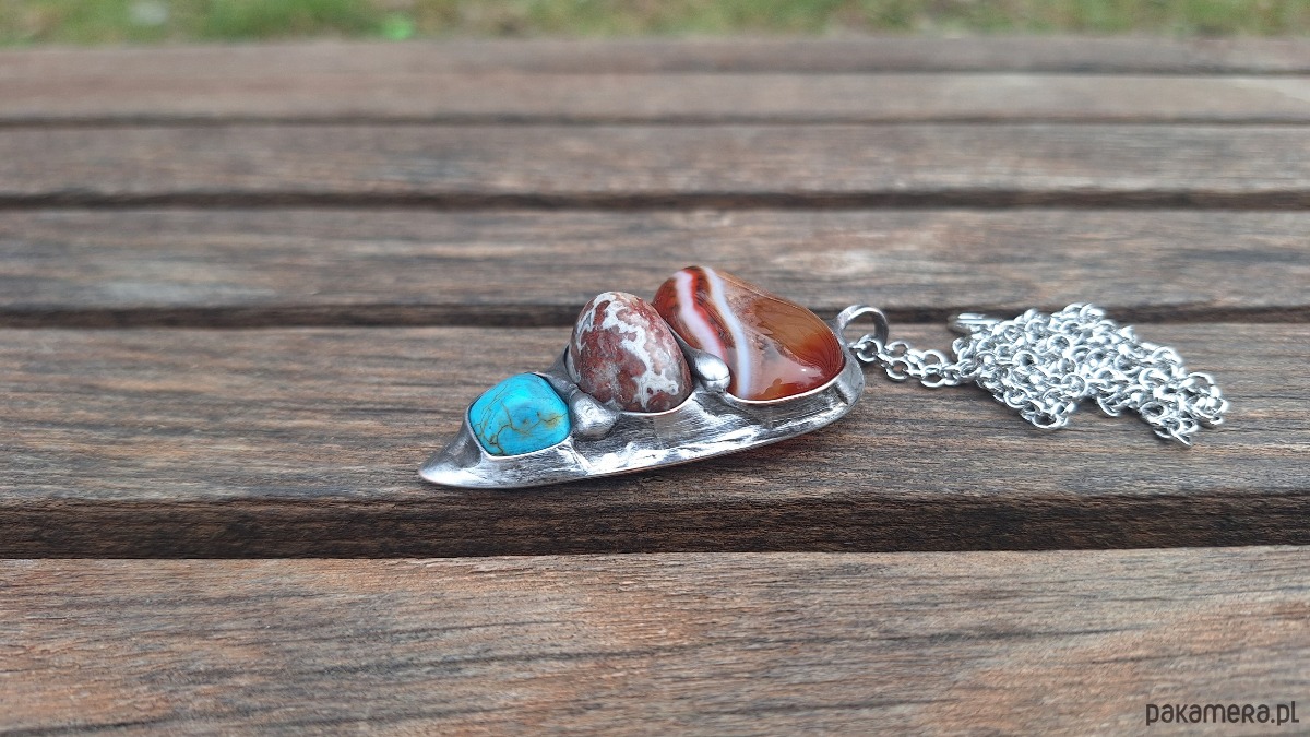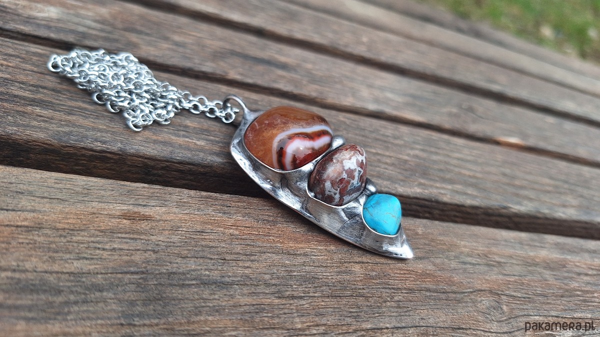Wisiorek wykonany z miedzi, cyny, howlitu i agatów. Wymiary ok. 6 na 3 cm. Zawieszony na łańcuszku o długości ok. 50 cm.
