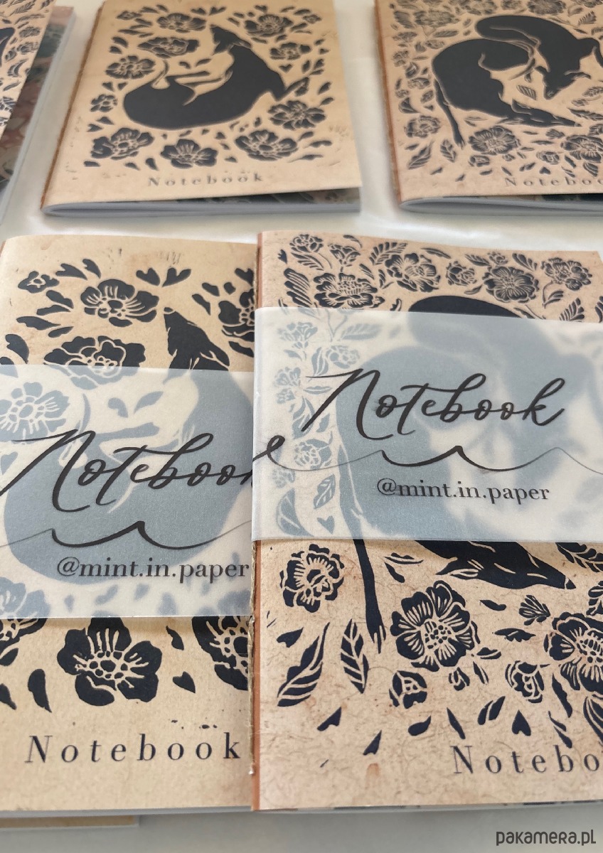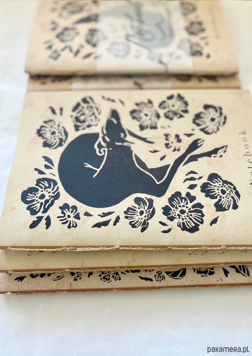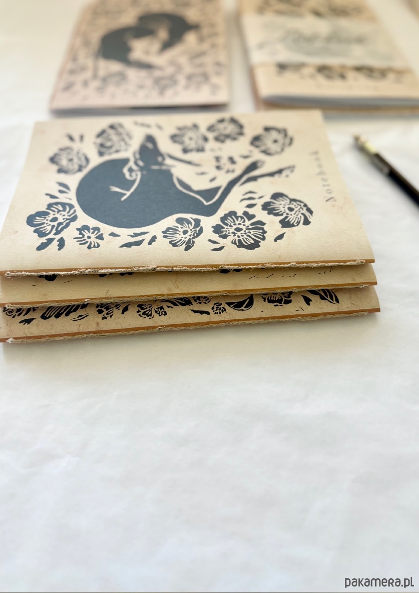 Ręcznie robione i szyte notesy z nadrukowaną grafiką wykonaną wcześniej w technice linorytu.