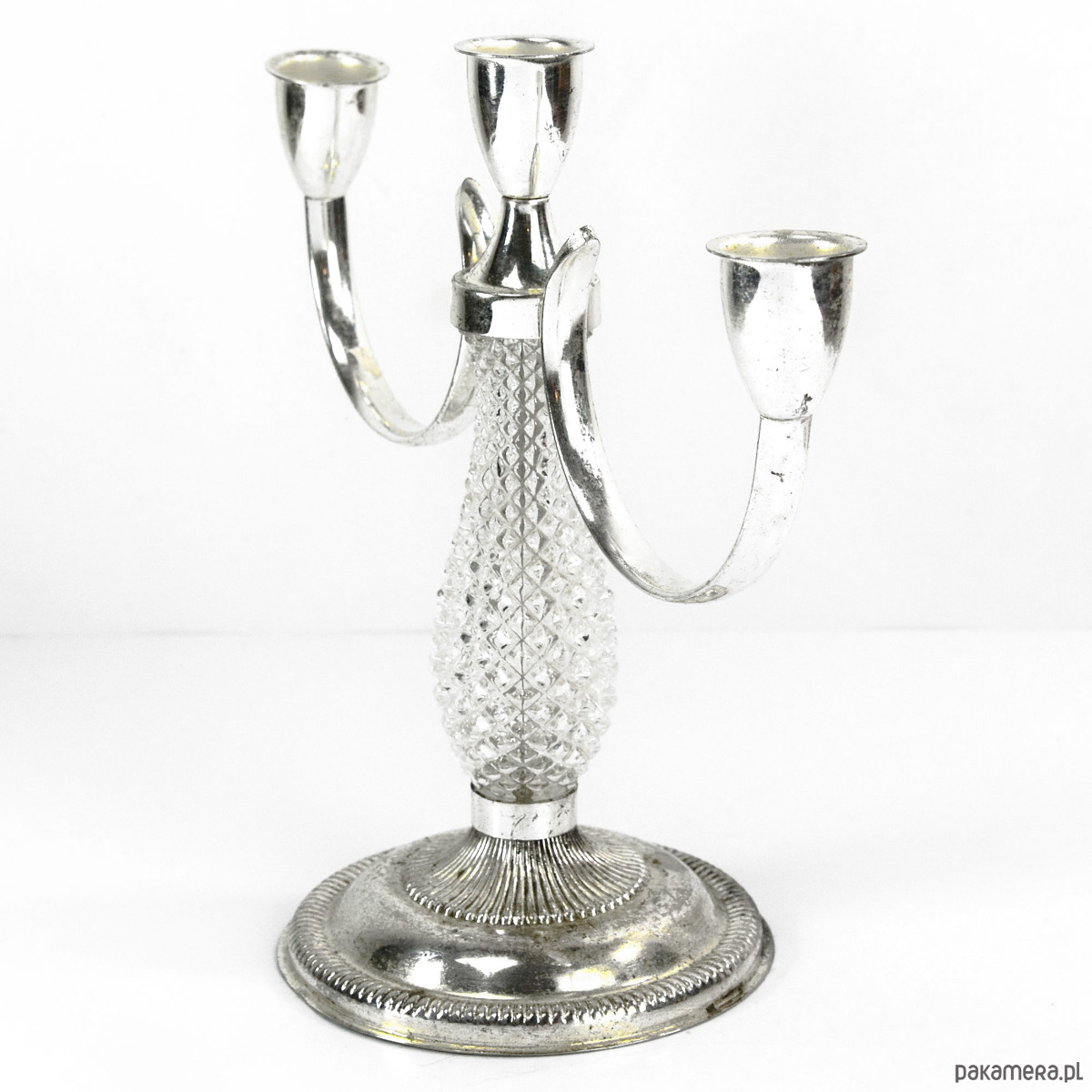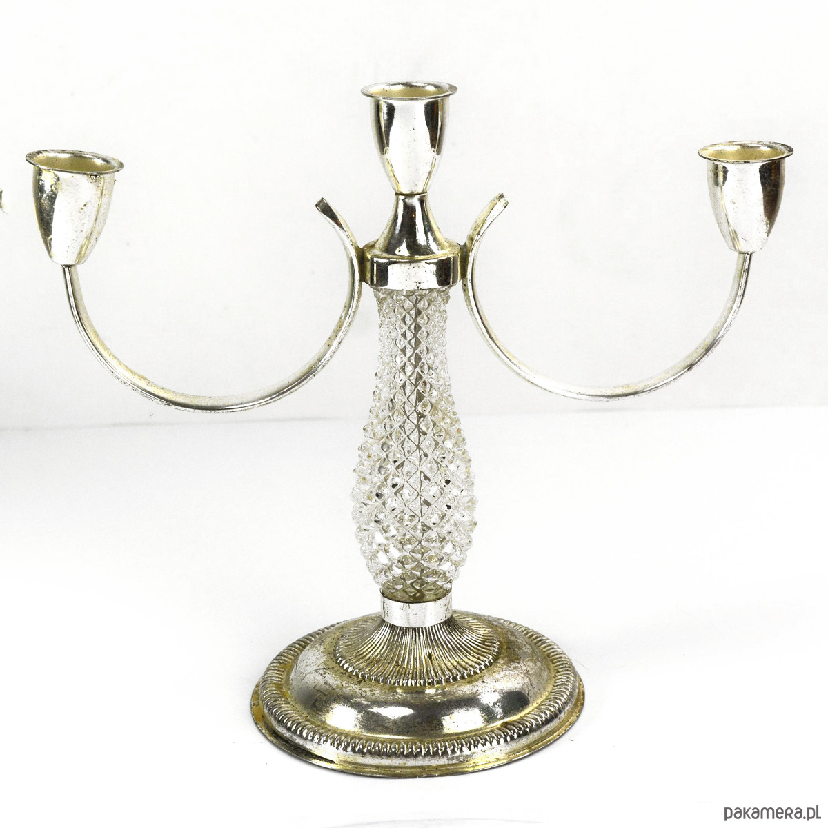 Świecznik platerowany z Francji, z lat 70. trójpunktowy, posrebrzany. wyprodukowany przez La Pierre. Modernistyczny świecznik o ciekawej, miękkiej formie zachowany jest w bardzo dobrym stanie, posiada jedynie niewielkie ślady użytkowania i upływu czasu w postaci drobnych rys i miejscowej patyny. Podstawa świecznika wykonana z prasowanego szkła kryształowego. Nie posiada uszkodzeń mechanicznych, ani ubytków. Piękny, ponadczasowy przedmiot. Zdjęcia nie oddają jego uroku. Przebarwienia na zdjęciach wynikają ze złego doświetlenia obiektu, nie są widoczne w rzeczywistości.