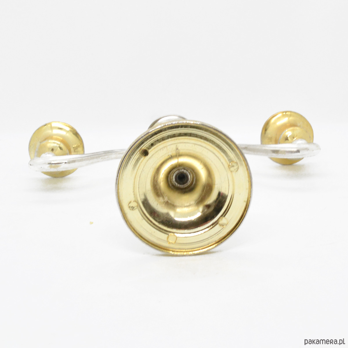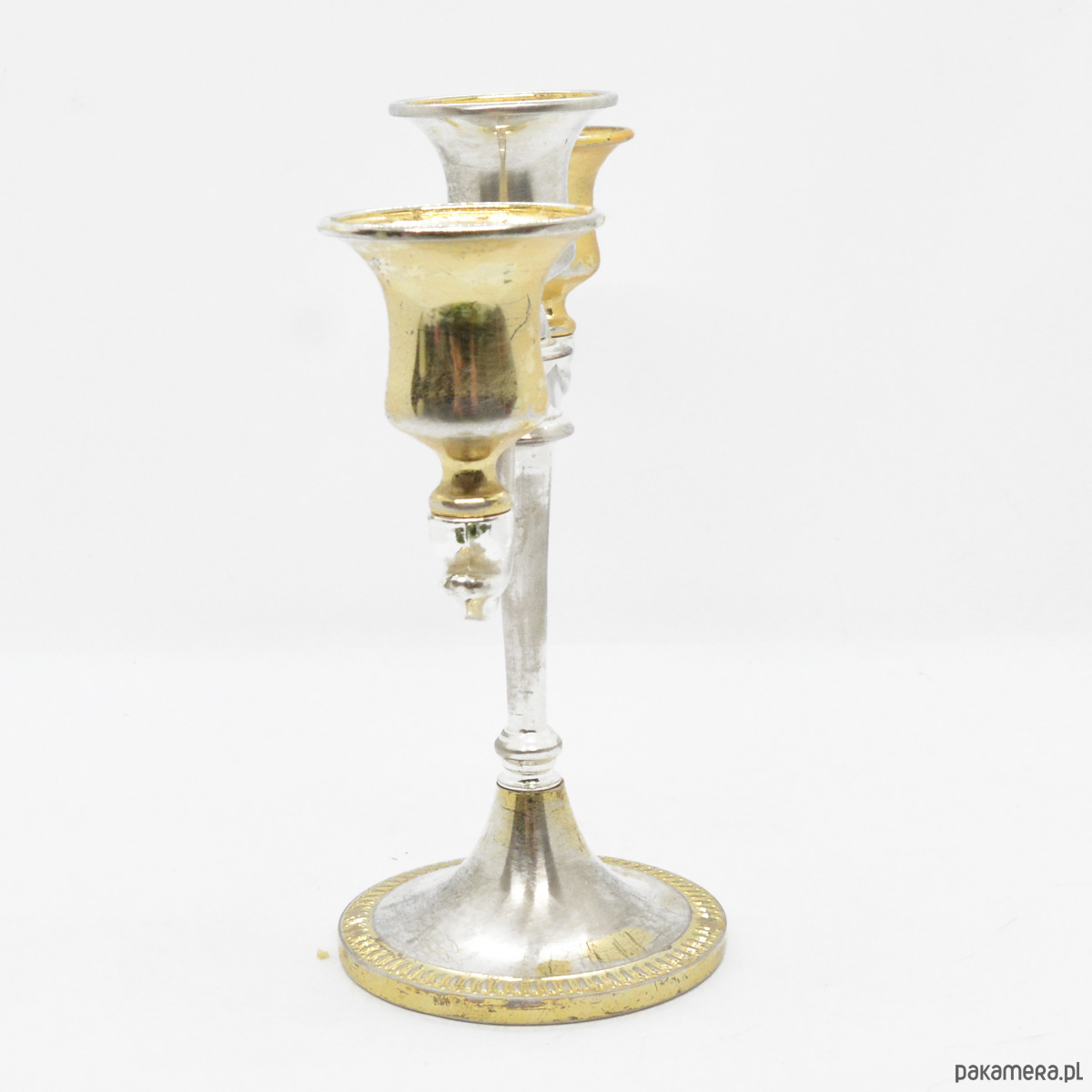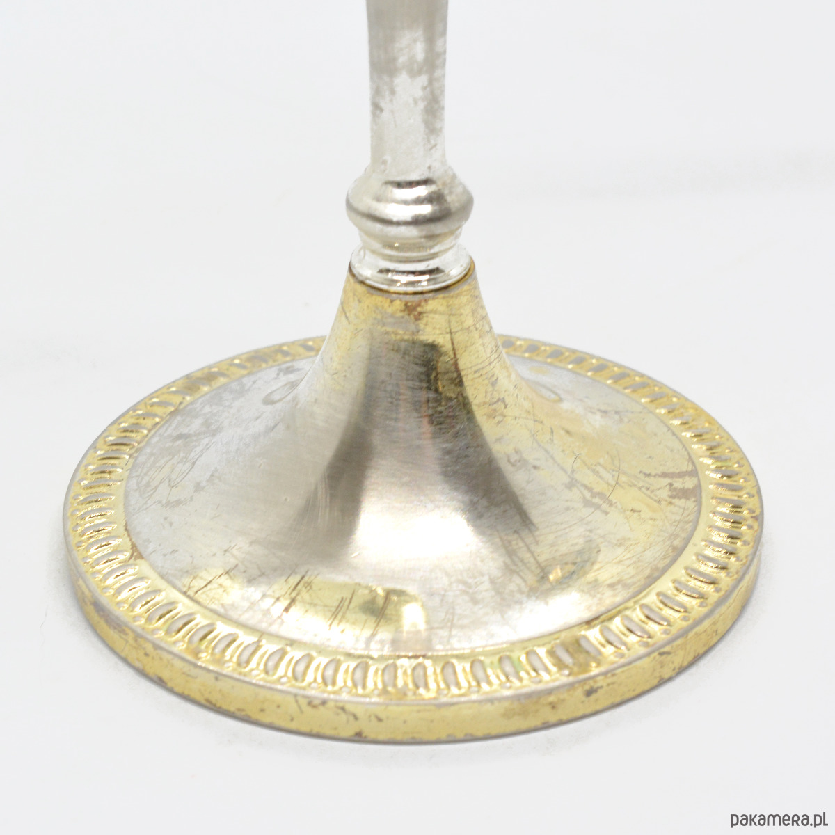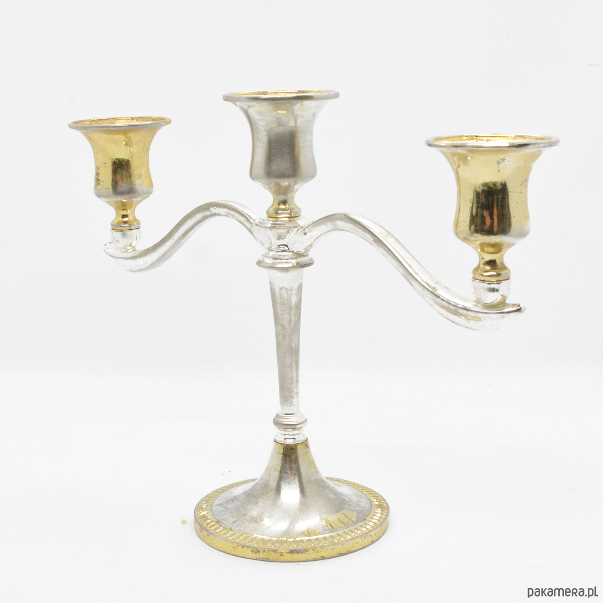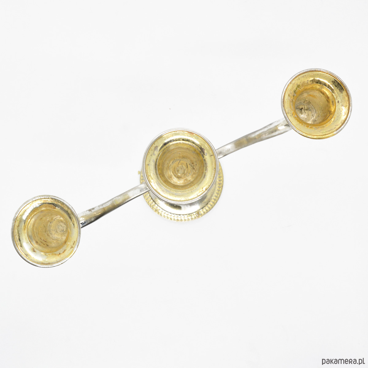 Świecznik platerowany z Niemiec, z połowy XX wieku trójpunktowy, posrebrzany. Klasyczny świecznik o ciekawej, miękkiej formie zachowany jest w dobrym stanie, posiada jedynie ślady użytkowania i upływu czasu w postaci drobnych rys i miejscowej patyny. Nie posiada uszkodzeń mechanicznych, ani ubytków. Piękny trzyramienny świecznik na Szabat, Jom Tow lub Jom Kippur.