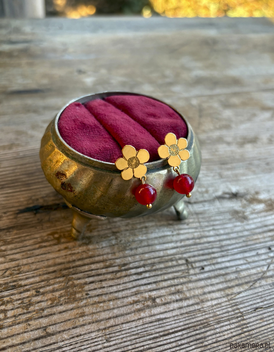 Owoc truskawki - Sztyfty z kwiatuszkiem oraz czerwonym kwarcem przypominającym małą truskawkę lub pożeczkę.