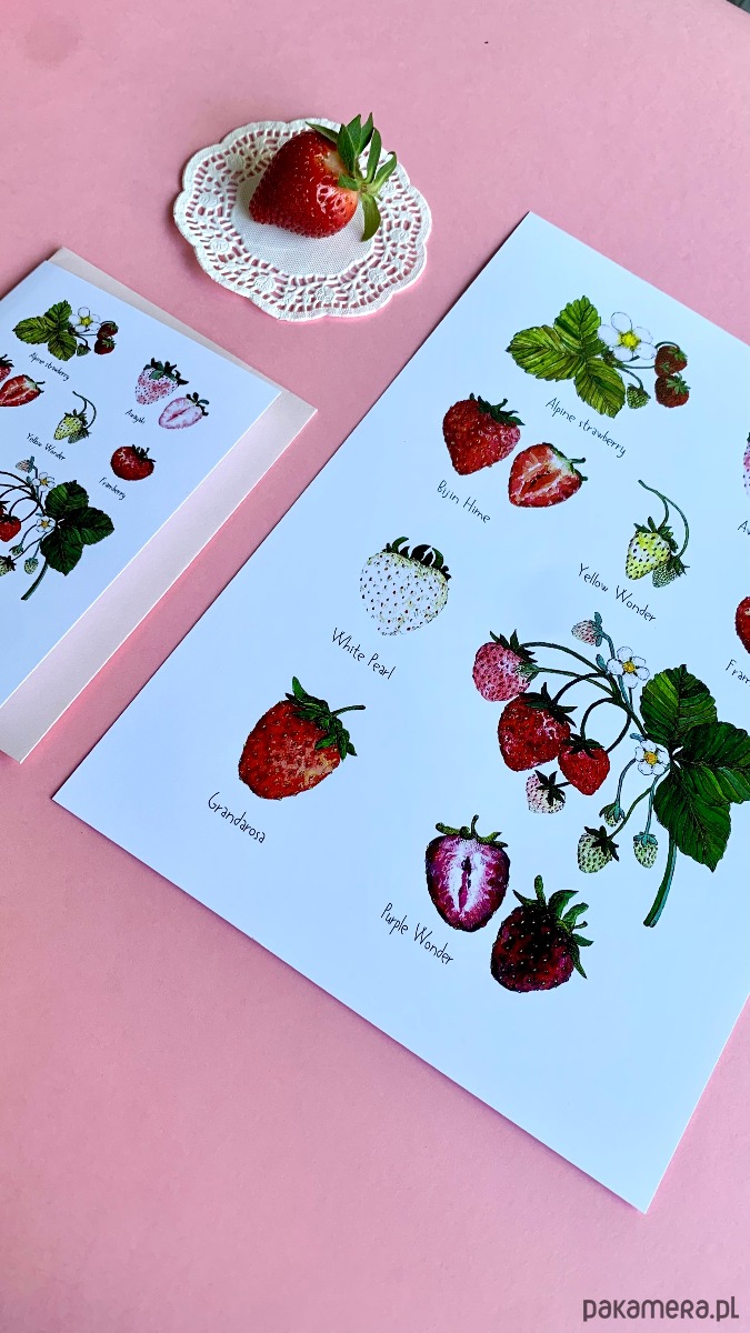 Truskawki, to wydruk autorskiej ilustracji inspirowanej owocami wczesnego lata oraz dawnymi rycinami.
