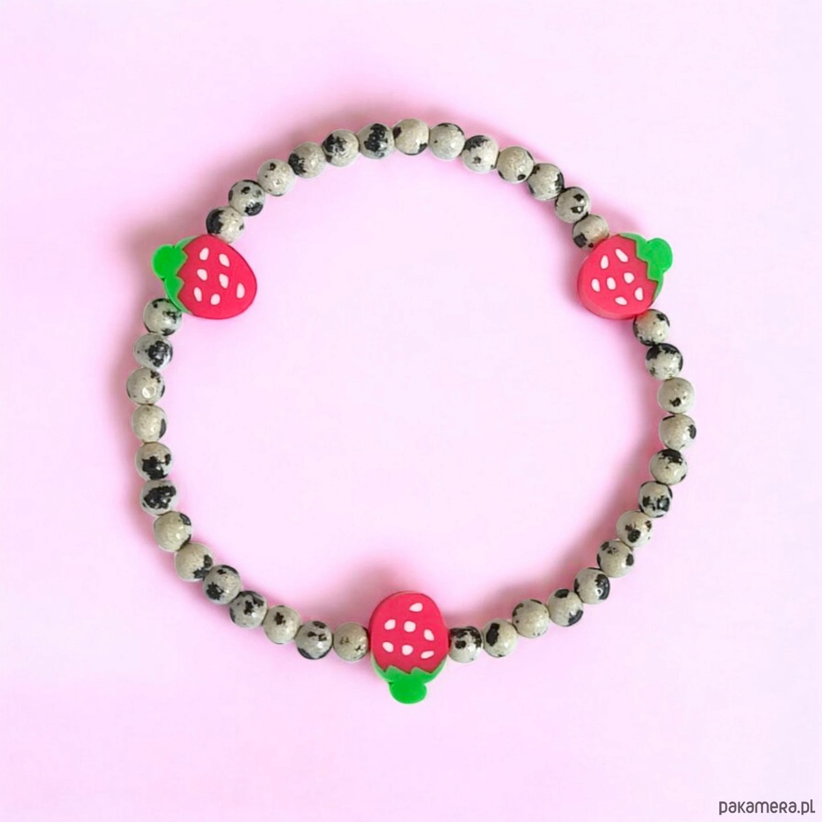 Urocza i niepoważna bransoletka na solidnej lince elastycznej, wykonana z jaspisu dalmatyńskiego (ok. 4mm) oraz truskawek z modeliny fimo.