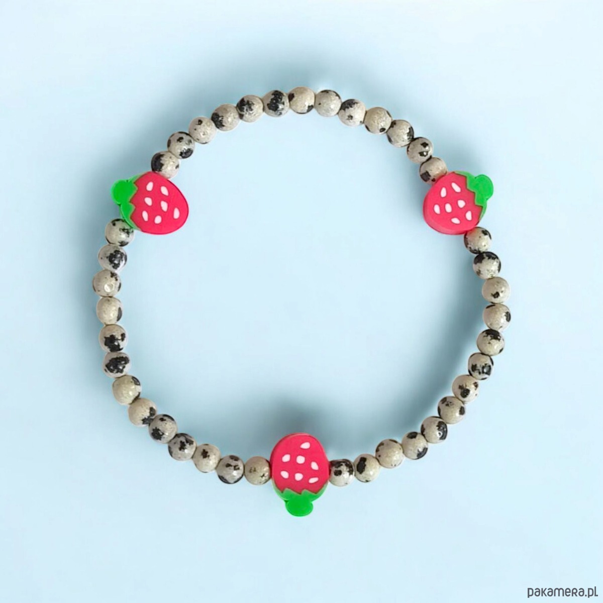 Urocza i niepoważna bransoletka na solidnej lince elastycznej, wykonana z jaspisu dalmatyńskiego (ok. 4mm) oraz truskawek z modeliny fimo.