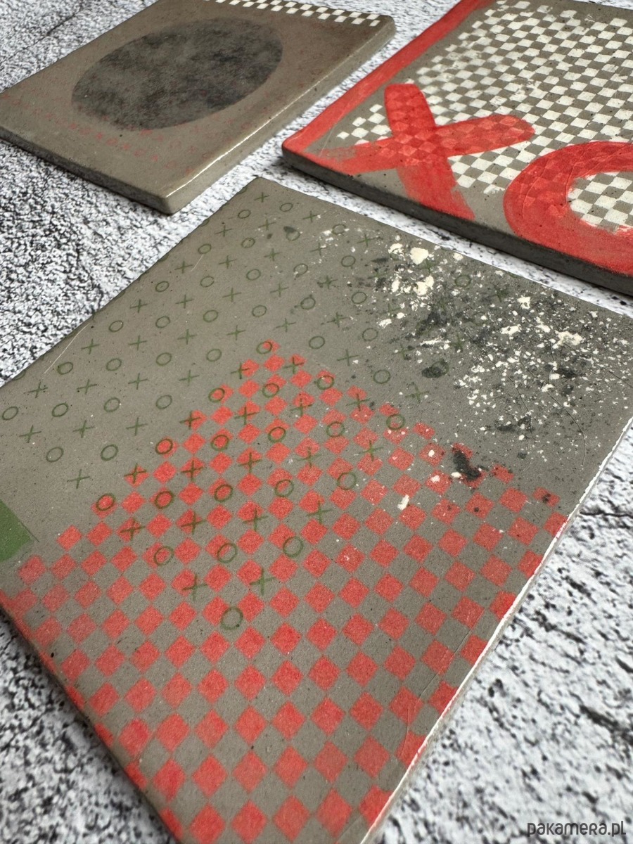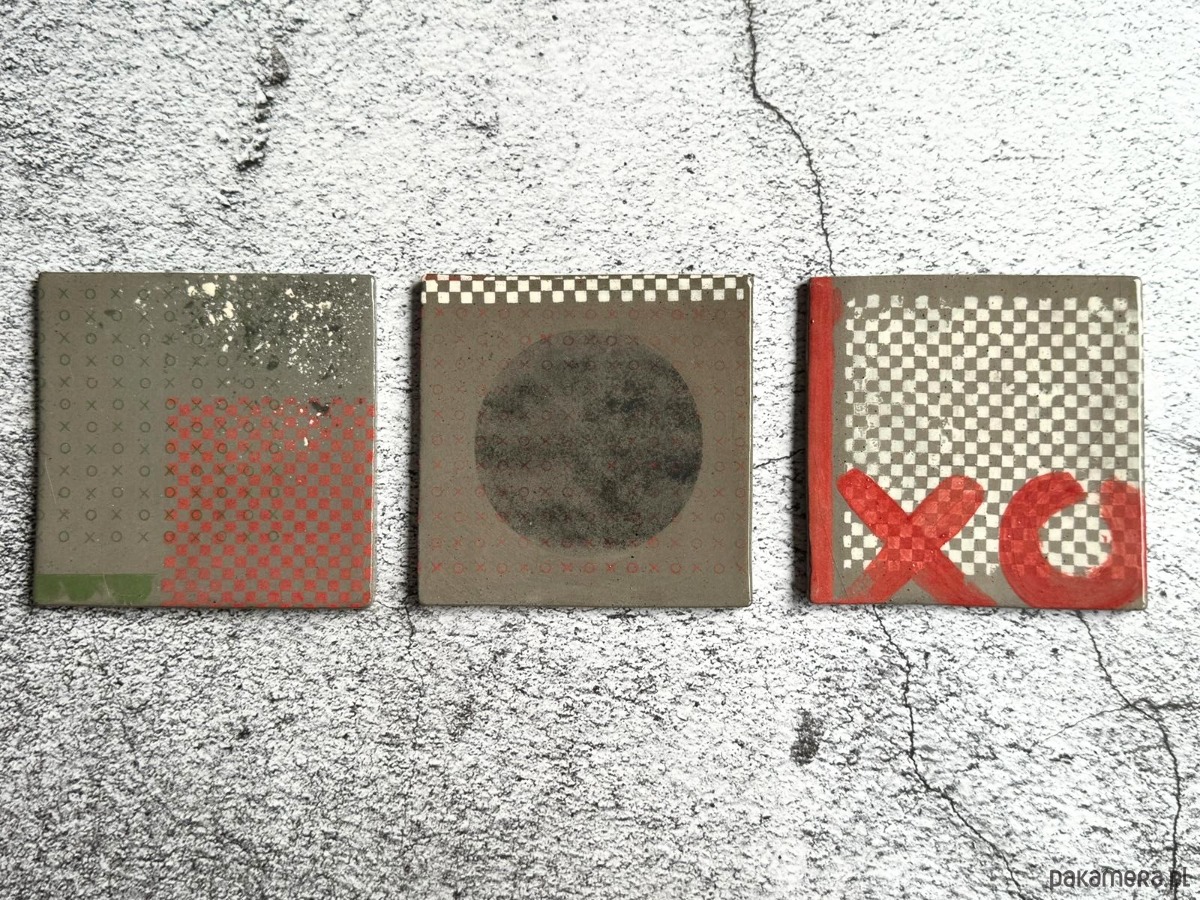 Geometryczny tryptyk sitodrukowany na ceramice o wymiarach 11x11 cm to zaproszenie do abstrakcyjnego świata kompozycji. Detale miniatur ukazują bogactwo geometrycznych kształtów, tworząc nie tylko dzieło sztuki, ale także przestrzeń do zabawy w kółko i krzyżyk. Emocje ukryte w subtelnych odcieniach bieli czerwieni i szarości tworzą malutki świat, zaklęty w ceramicznym kwadracie. Obrazki mają z tyłu zamontowane haczyki do zawieszenia.