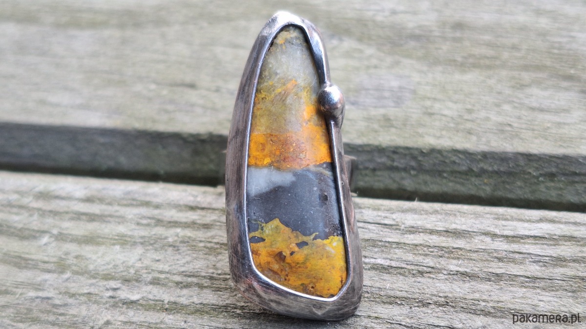 Pierścionek wykonany z miedzi, cyny i jaspisu bumble bee. Wymiary ok. 3.5 na 1.3 cm. Regulowany. Nie jest ciężki.