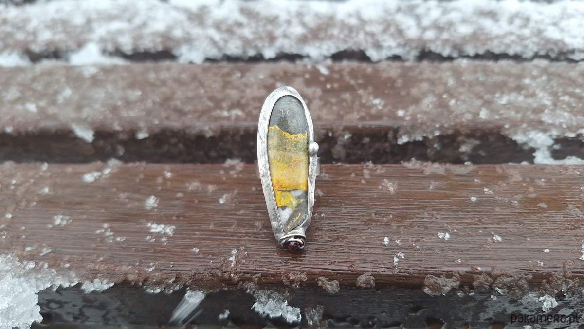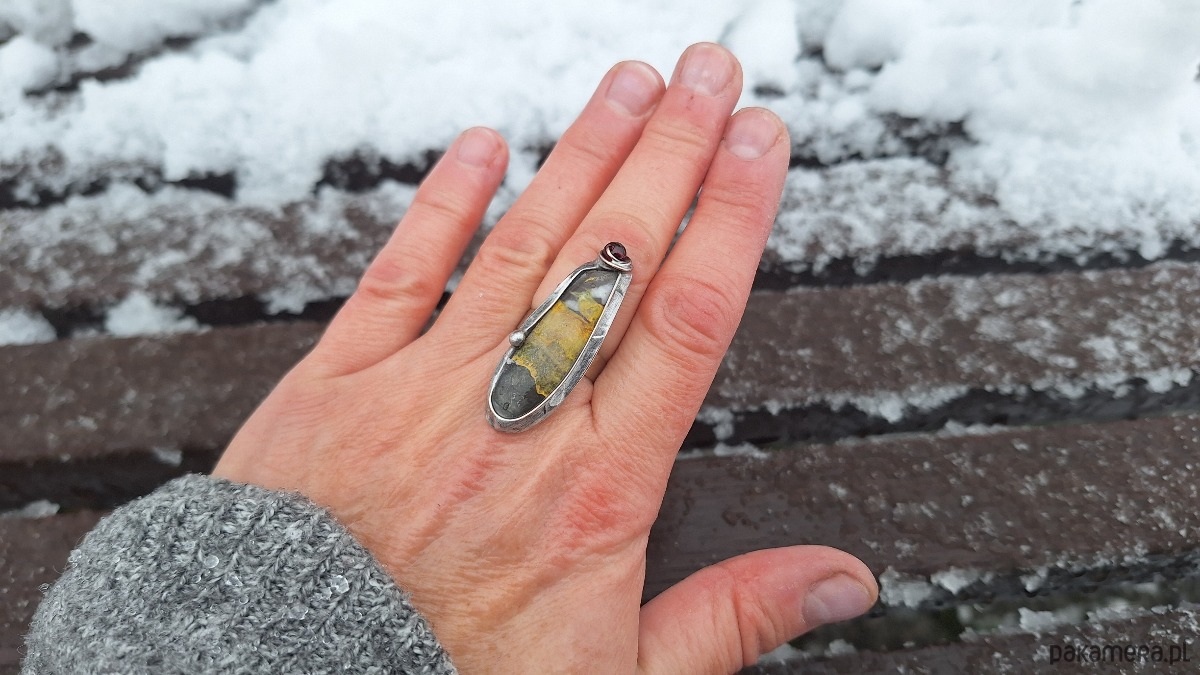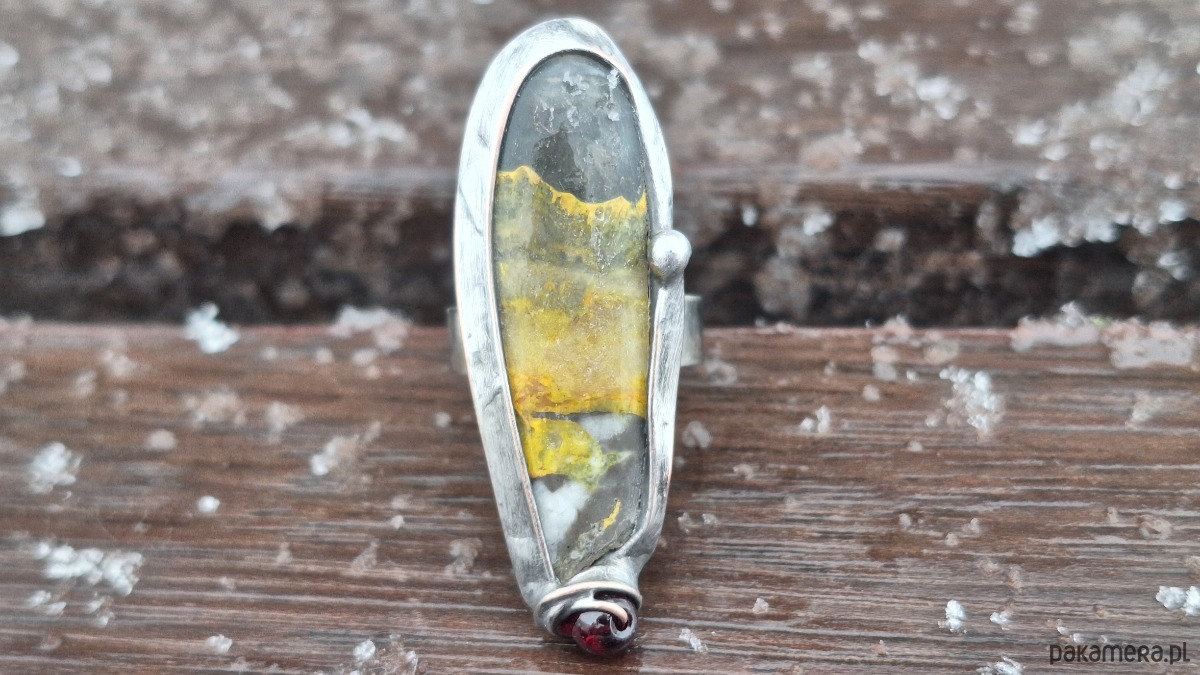 Pierścionek wykonany z miedzi, cyny, granatu i jaspisu bumble bee. Wymiary ok. 3.8 na 1.2 cm. Regulowany. Nie jest ciężki.