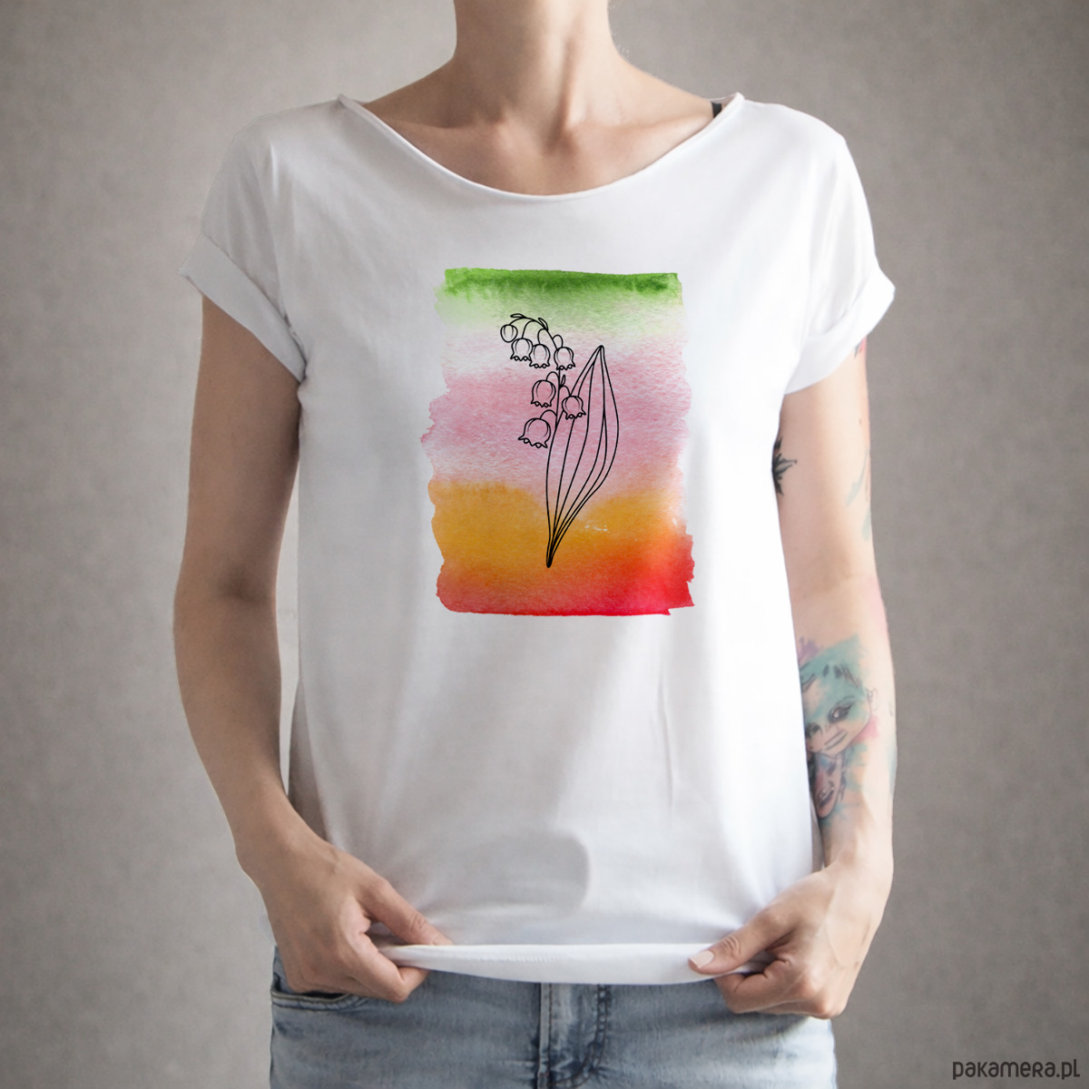 Cienka linia konwalii spotyka się z energetycznym, akwarelowym tłem w przejściu zieleni, różu i ciepłej czerwieni z nutą pomarańczy.