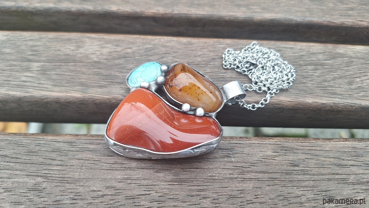 Wisiorek wykonany z miedzi, cyny, jaspisu, howlitu i agatu. Wymiary ok. 5.5 na 4.5 cm. Zawieszony na łańcuszku o długości ok. 50 cm.