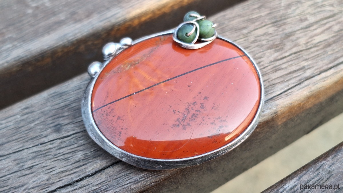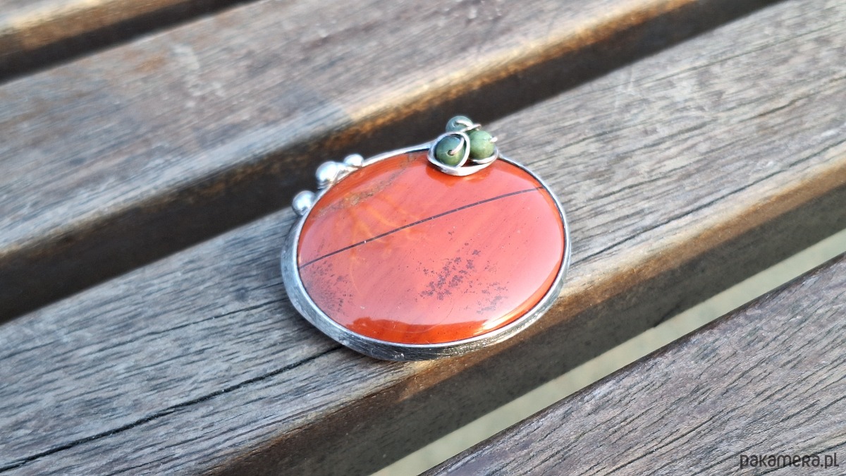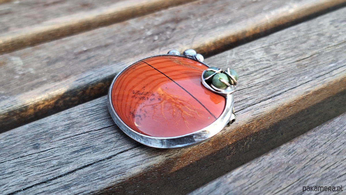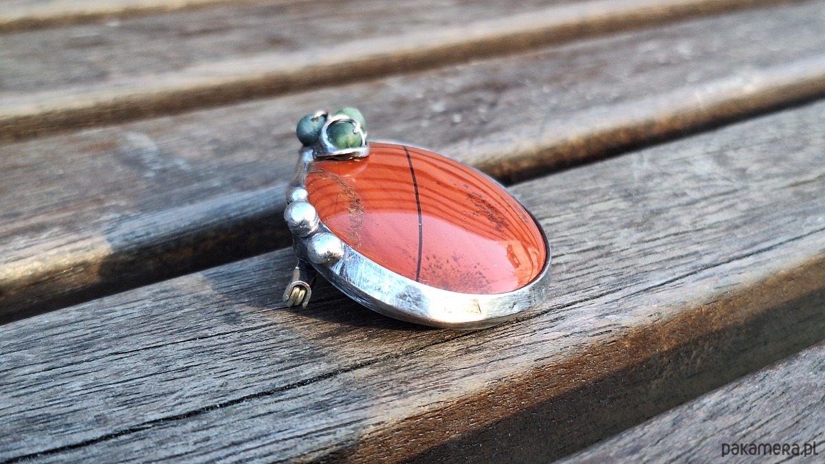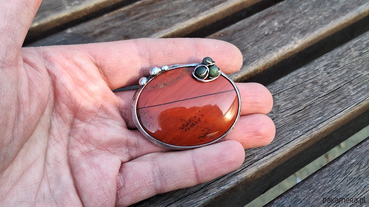 Broszka wykonana z miedzi, cyny, jaspisu i nefrytów. Wymiary ok. 4.5 na 3.5 cm. Zapięcie metalowe.