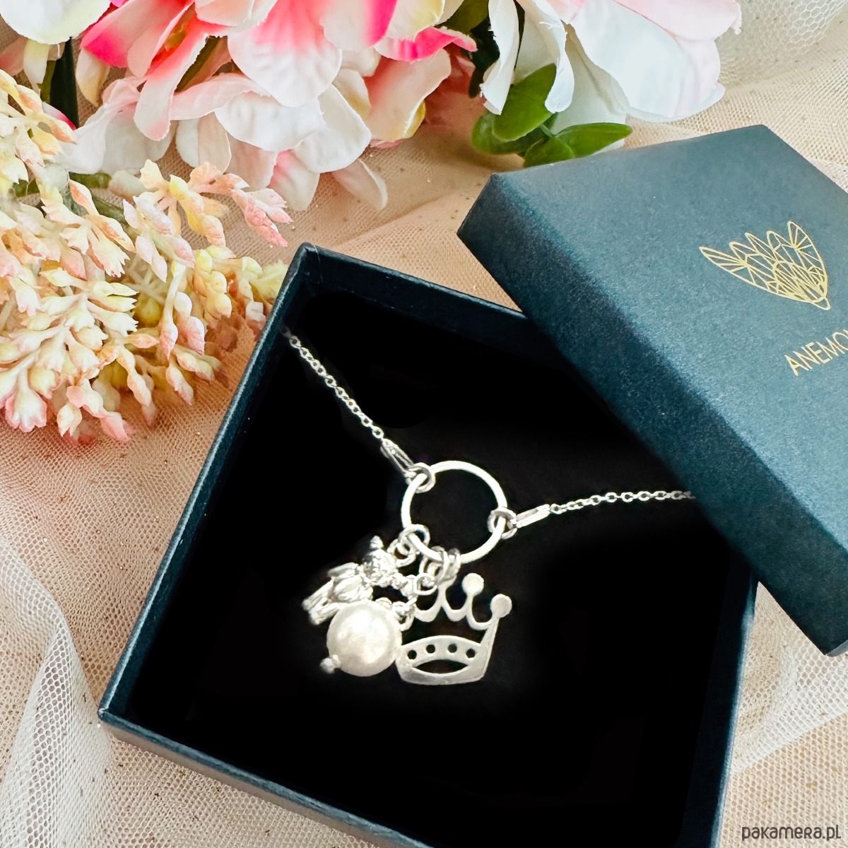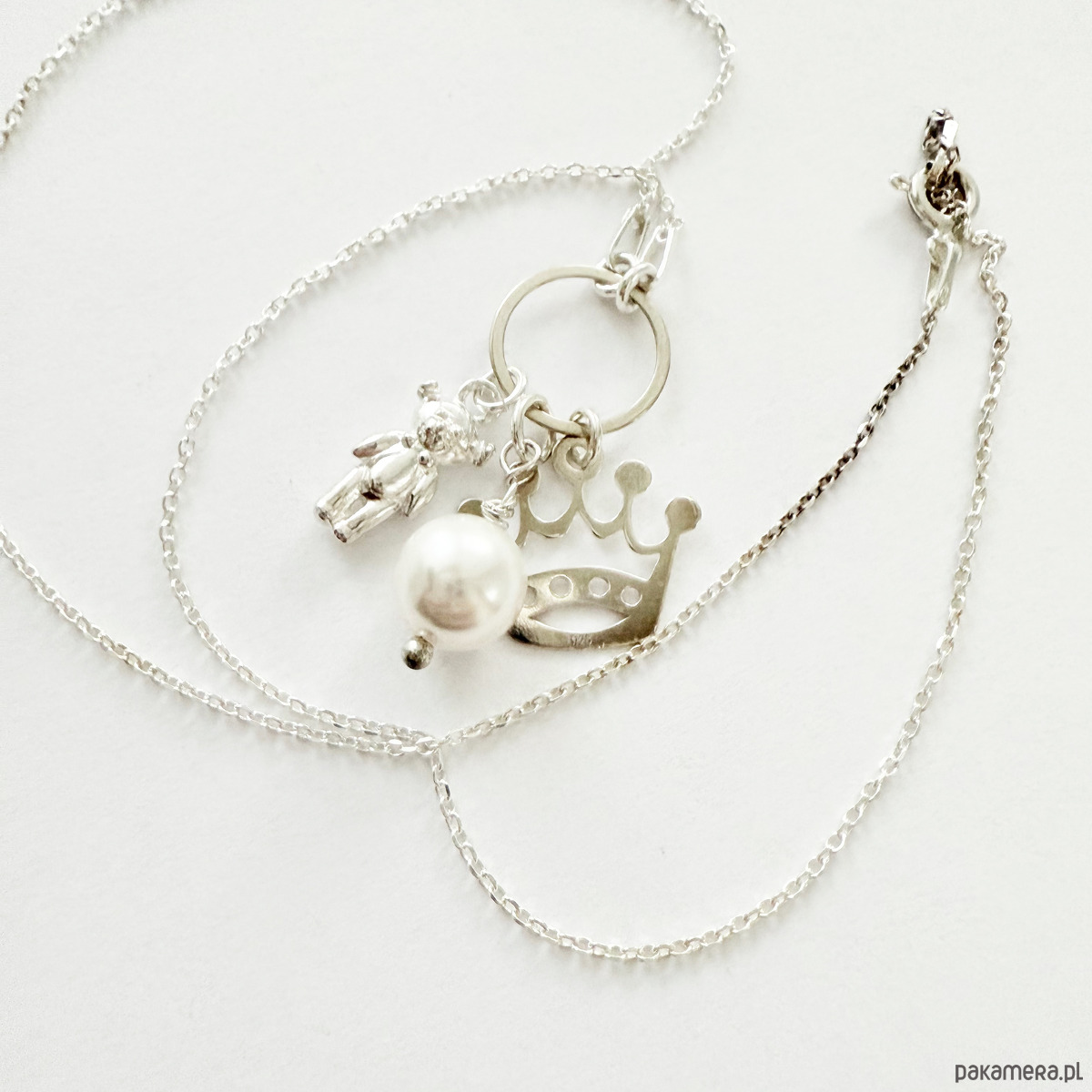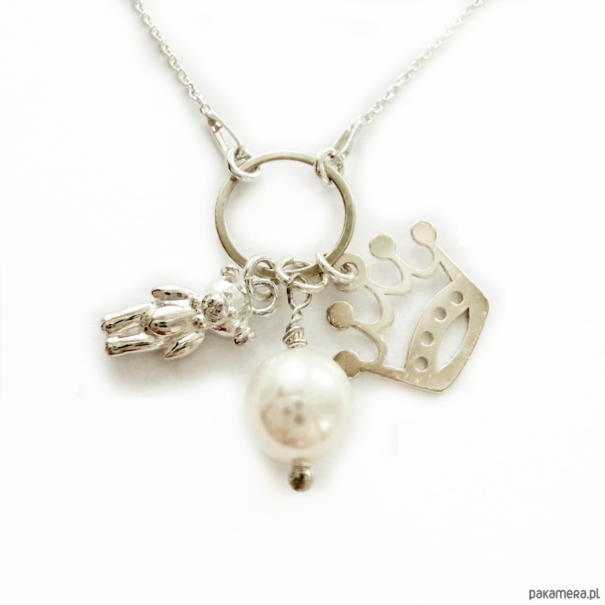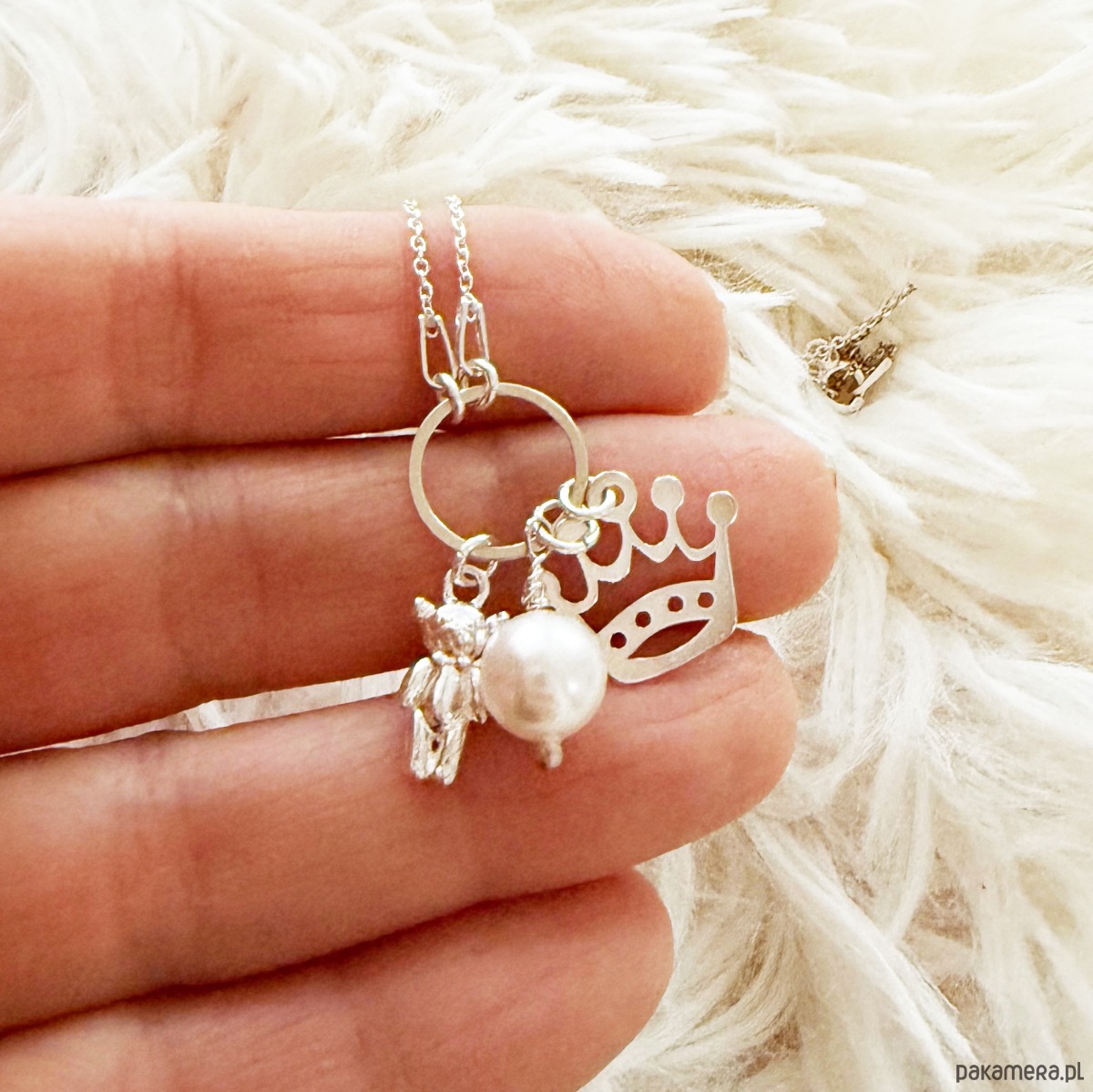 Odkryj wyjątkowy naszyjnik, który łączy w sobie elegancję, delikatność i odrobinę dziecięcej beztroski. ozdobiony trzema symbolicznymi zawieszkami – koroną, perłą i uroczym misiem – tworzy niepowtarzalną biżuterię pełną emocji.
