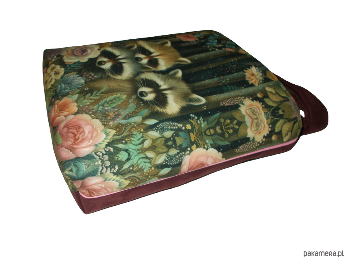 Autorska torba z usztywnionego eko zamszu, zapinana na zamek. Przód z weluru tapicerskiego. Pasek regulowany. Tył w kolorze paska (burgund). Torba trzyma fason. Wewnątrz dwie kieszenie - jedna na zamek, druga z miejscem na telefon i coś jeszcze. W szwach wypustka. Denko poszerzone. szerokość 32cm wysokość 30cm plus denko 8cm