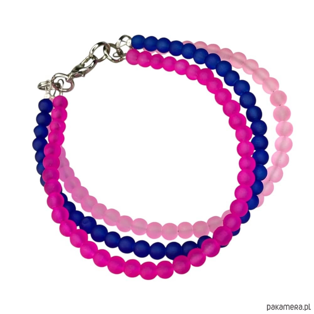 Bransoletka wykonana ze szklanych koralików składa się z trzech rzędów matowych elementów w zróżnicowanych tonacjach, które razem tworzą wyrazistą, a jednocześnie harmonijną kompozycję. Kobiecy róż zyskuje tu bardziej zdecydowany charakter dzięki granatowym kontrastom, nadając całości świeży i nowoczesny wygląd. To biżuteria idealna do codziennego noszenia - uzupełnia luźne stylizacje, dodaje im energii i dobrze komponuje się zarówno z jasnymi, jak i ciemniejszymi ubraniami. Srebrzyste detale oraz funkcjonalne zapięcie typu karabińczyk zapewniają komfort, trwałość i swobodę noszenia każdego dnia.
