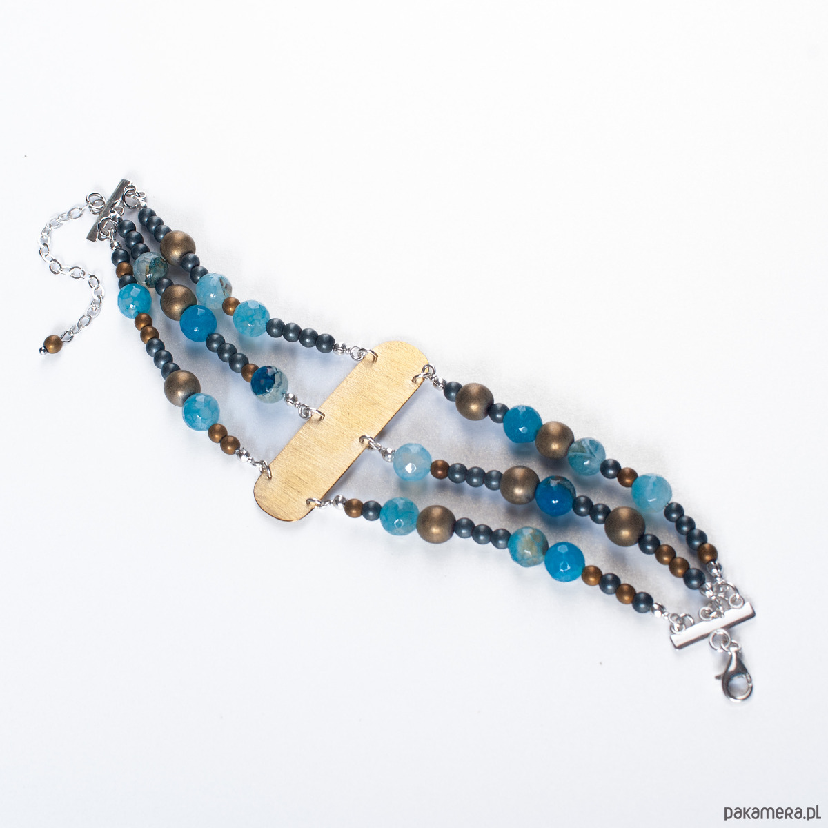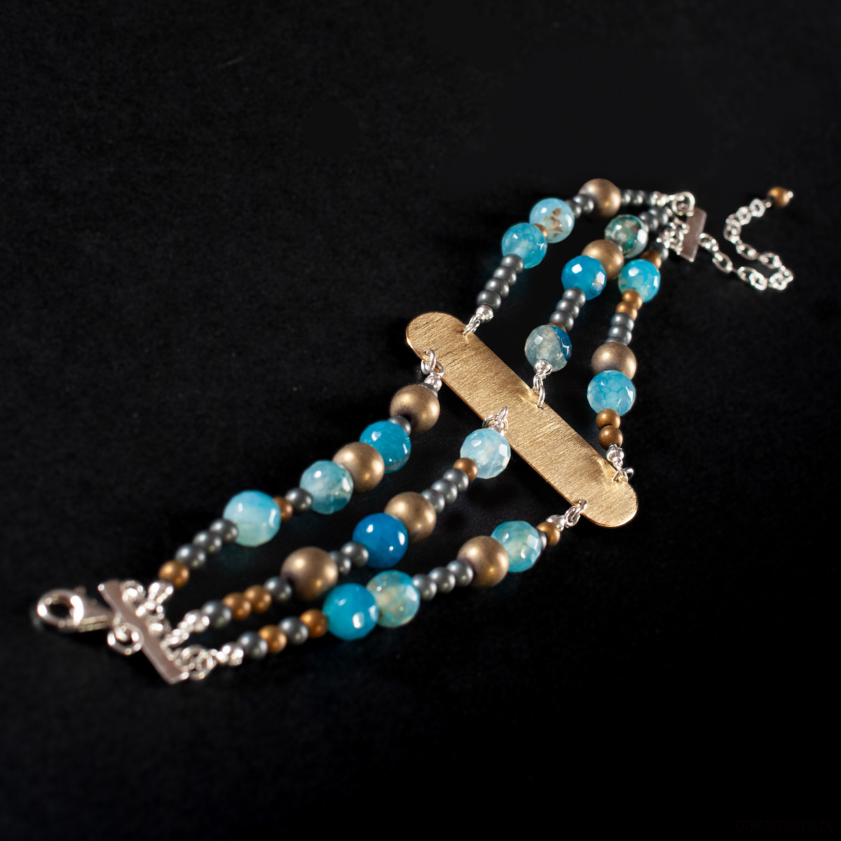 Efektowna, trzyrzędowa bransoletka z kolekcji SZAMANKA. W centralnym miejscu znajduje się łączący wszystkie rzędy satynowy, prosty element z mosiądzu. Delikatnie mieni się i połyskuje przyciągając uwagę. Rozłożone nieregularnie po prawej i lewej stronie agaty i hematyty zachwycają różnorodnością odcieni. Połączony z zapięciem srebrny łańcuszek daje możliwość zwiększenia długości. Wykorzystane elementy metalowe zrobione są ze srebra 925. Bransoletka wykonana jest ręcznie według własnych projektów w pracowni Anillo. Biżuterię starannie pakujemy i wysyłamy w eleganckim kartoniku.