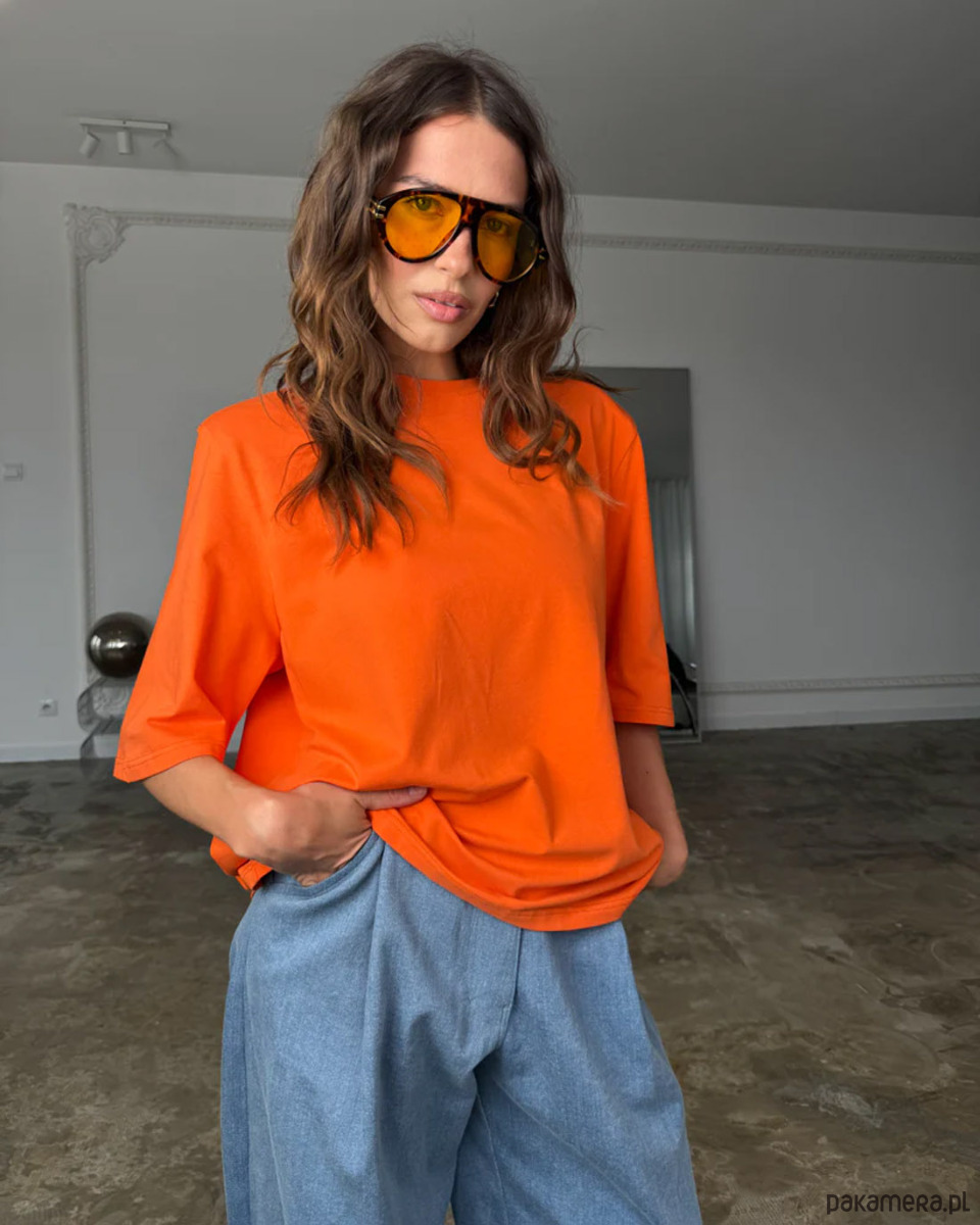 T-shirt Art Orange to nowoczesna interpretacja minimalistycznej klasyki, w której prostota formy spotyka się z energetycznym kolorem. Intensywny odcień pomarańczy dodaje stylizacji świeżości i pewności siebie, pozostając jednocześnie elegancką i wyrazistą bazą kapsułowej garderoby.