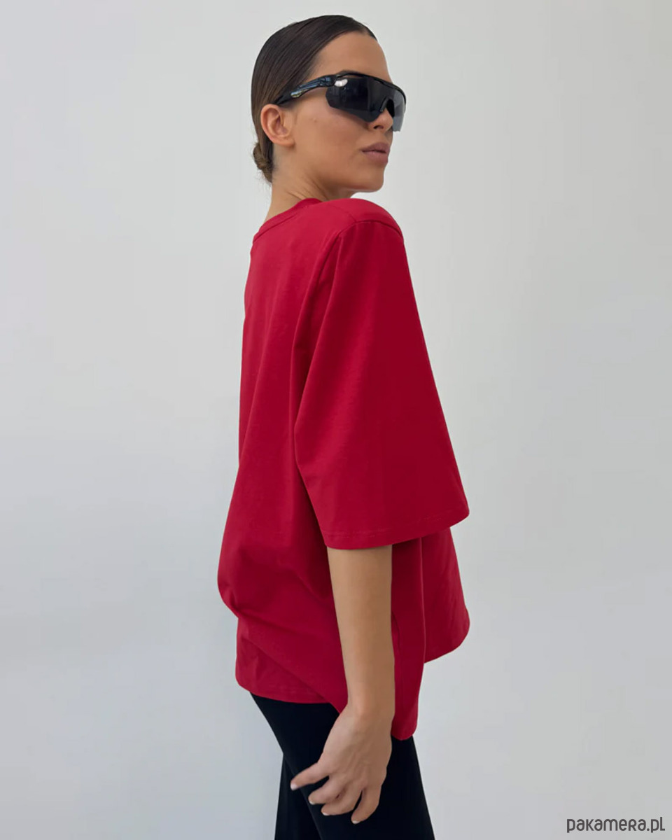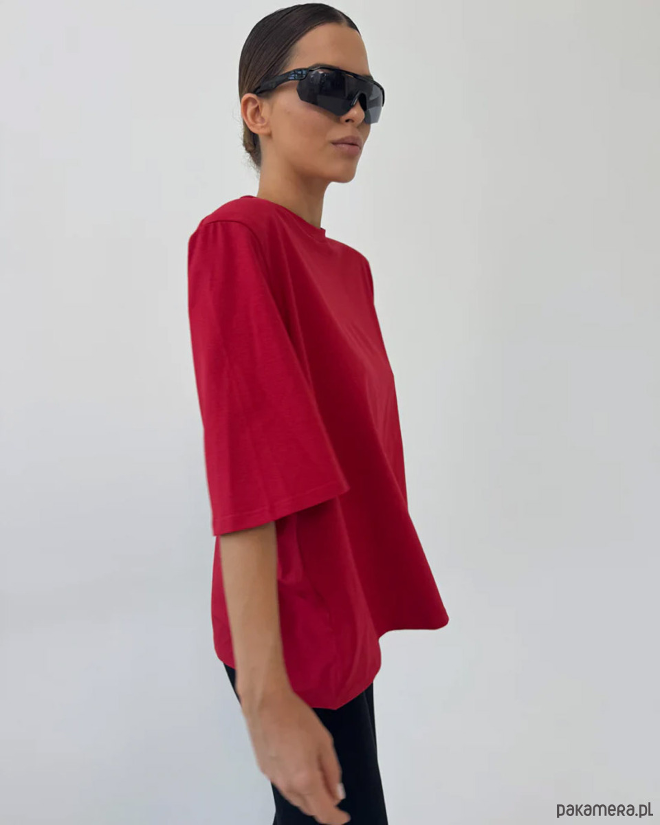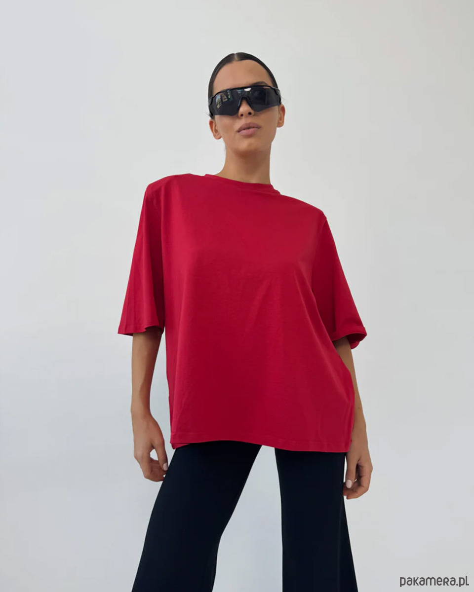 T-shirt Art Red to nowoczesna interpretacja minimalistycznej klasyki, w której prostota formy spotyka się z wyrazistym kolorem. Intensywna czerwień nadaje stylizacji energii i pewności siebie, pozostając jednocześnie elegancką i ponadczasową bazą kapsułowej garderoby.