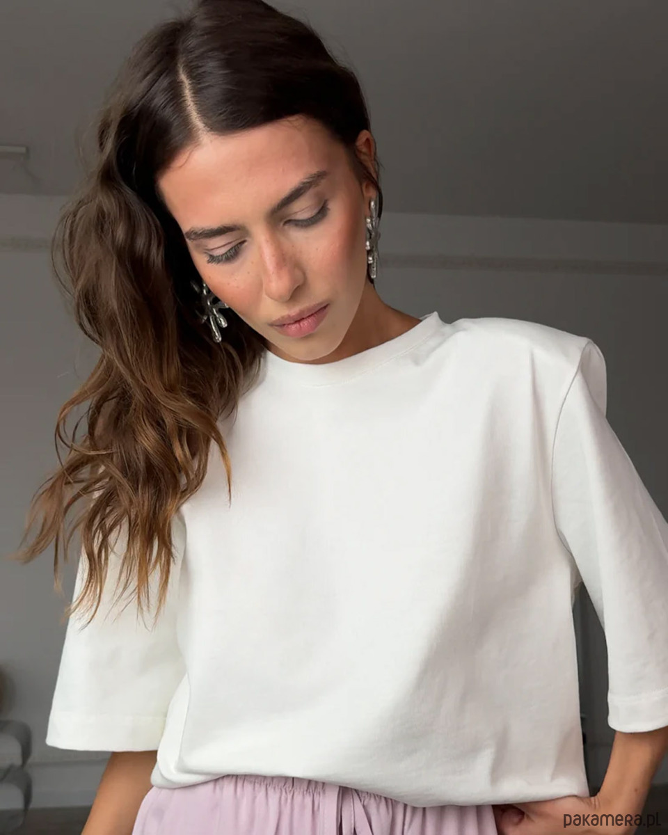 Czysta biel w odcieniu natural white podkreśla architekturę kroju, a przemyślana, bardziej zdecydowana forma sprawia, że t-shirt sam w sobie staje się centralnym punktem looku. Dzięki odpinanym poduszkom na ramionach możesz regulować efekt – od wyraźnie zarysowanej, strukturalnej sylwetki po bardziej miękką, naturalną linię.