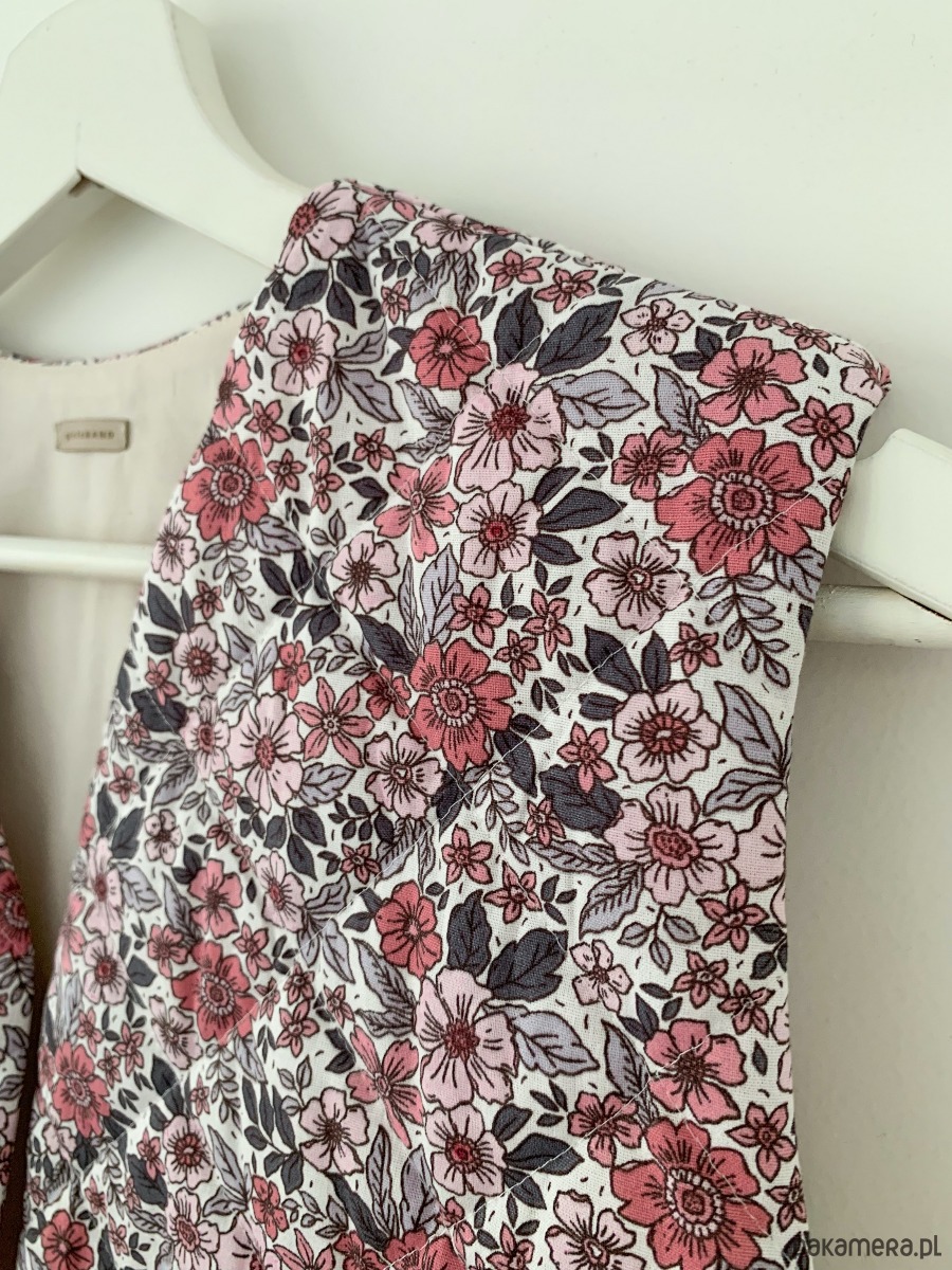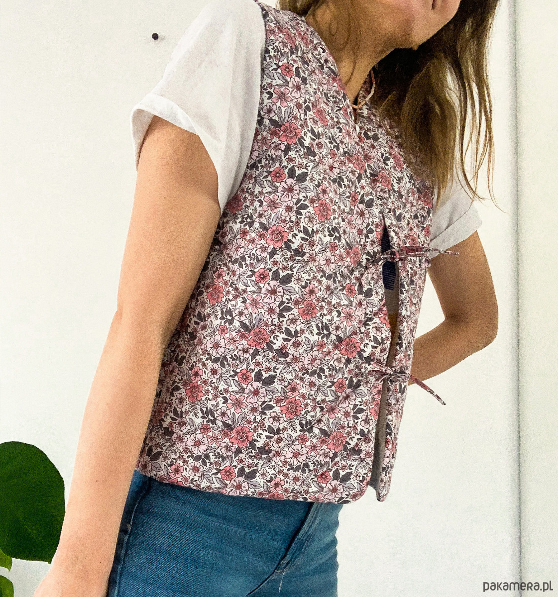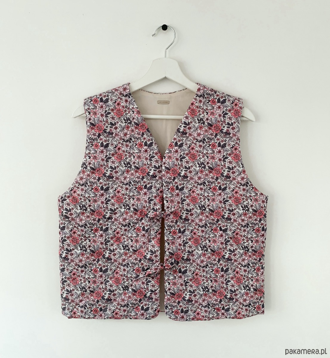 Pikowana kamizelka damska TULA w drobny kwiatkowy wzór to hit tego sezonu wiosna-lato! Idealna opcja zarówno jako dopełnienie basicowej stylizacji z białym t-shirtem lub bluzą, ale także świetny akcent przy boho lotku. Wiązana na sznureczki kamizelka z podszewką w kolorze ecru jest piękna i lekka - idealna na cieplejsze dni! Uszyta z bawełny z certyfikatem Oeko-Tex Standard 100.