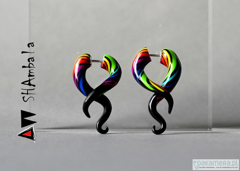 Multikolorowe, awangardowe, etniczne kolczyki. Wykonane zostały z tworzywa sztucznego. Wewnątrz znajdują się srebrne zapięcia. Ciekawe, zabawne, zaskakujące. Wymiary tulejek to ok. 2,2 cm na 4 cm. Polecam:)