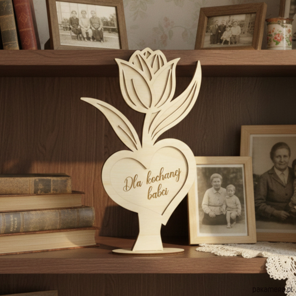 Tulipan Kwiatek dla Babci Drewniana Figurka na Podstawce na Dzień Babci