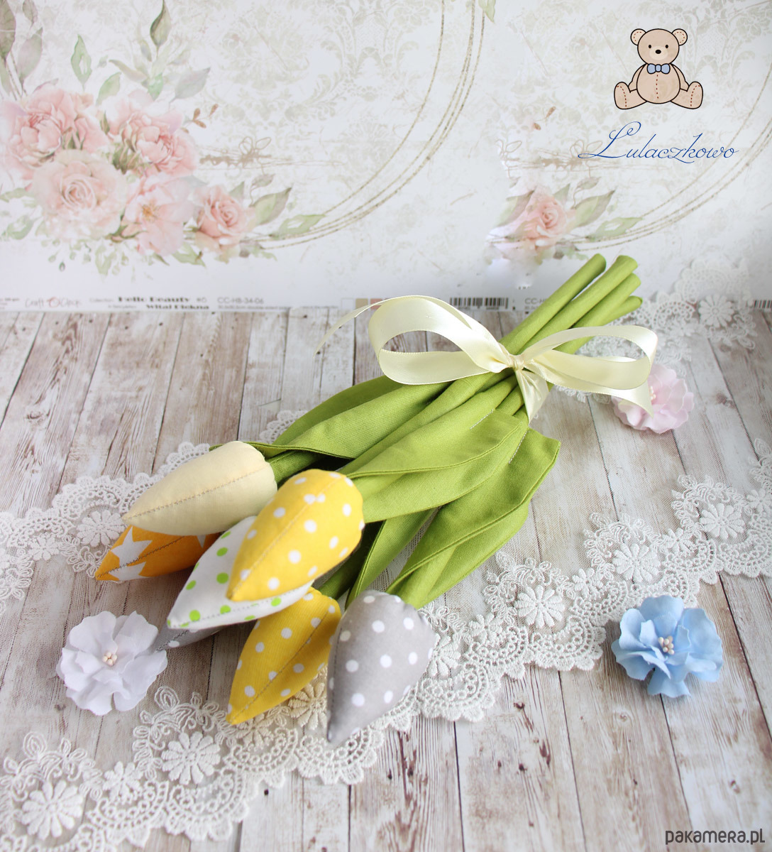 Ręcznie szyte materiałowe tulipany. Uszyte z najwyższą starannością ze 100% bawełny, wypełnione antyalergiczną kulką silikonową.