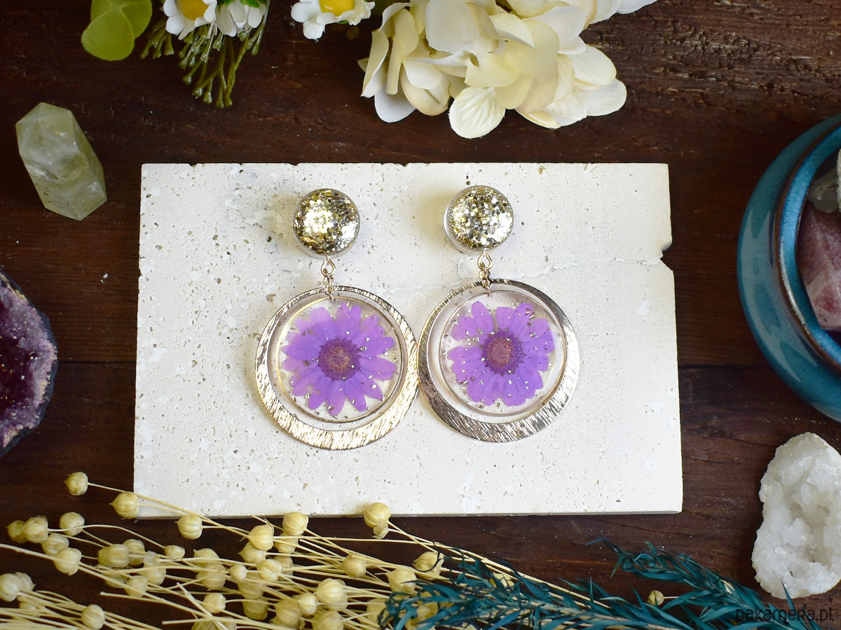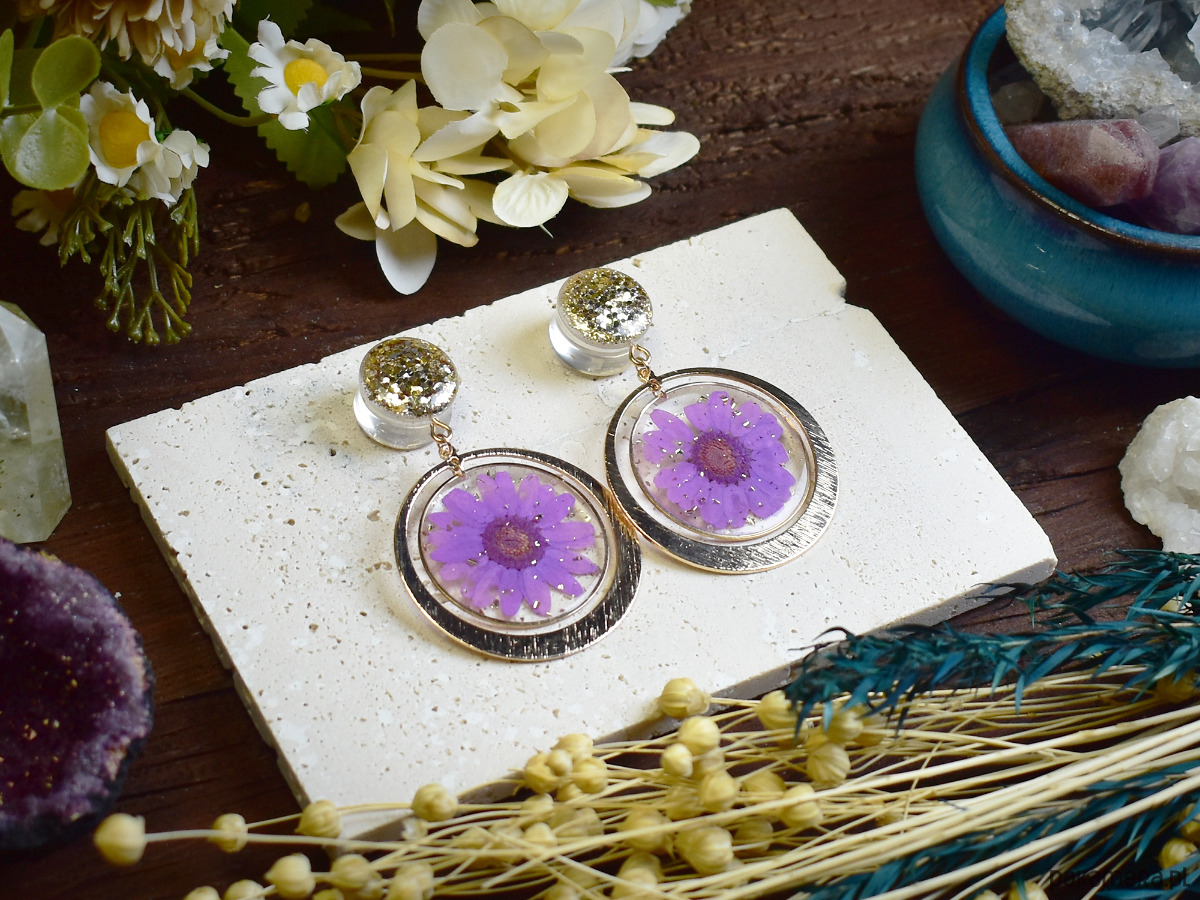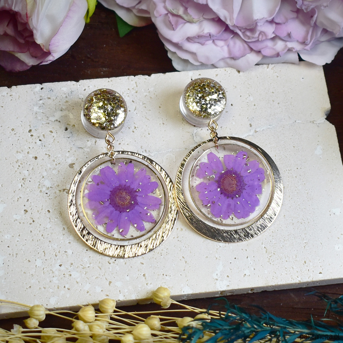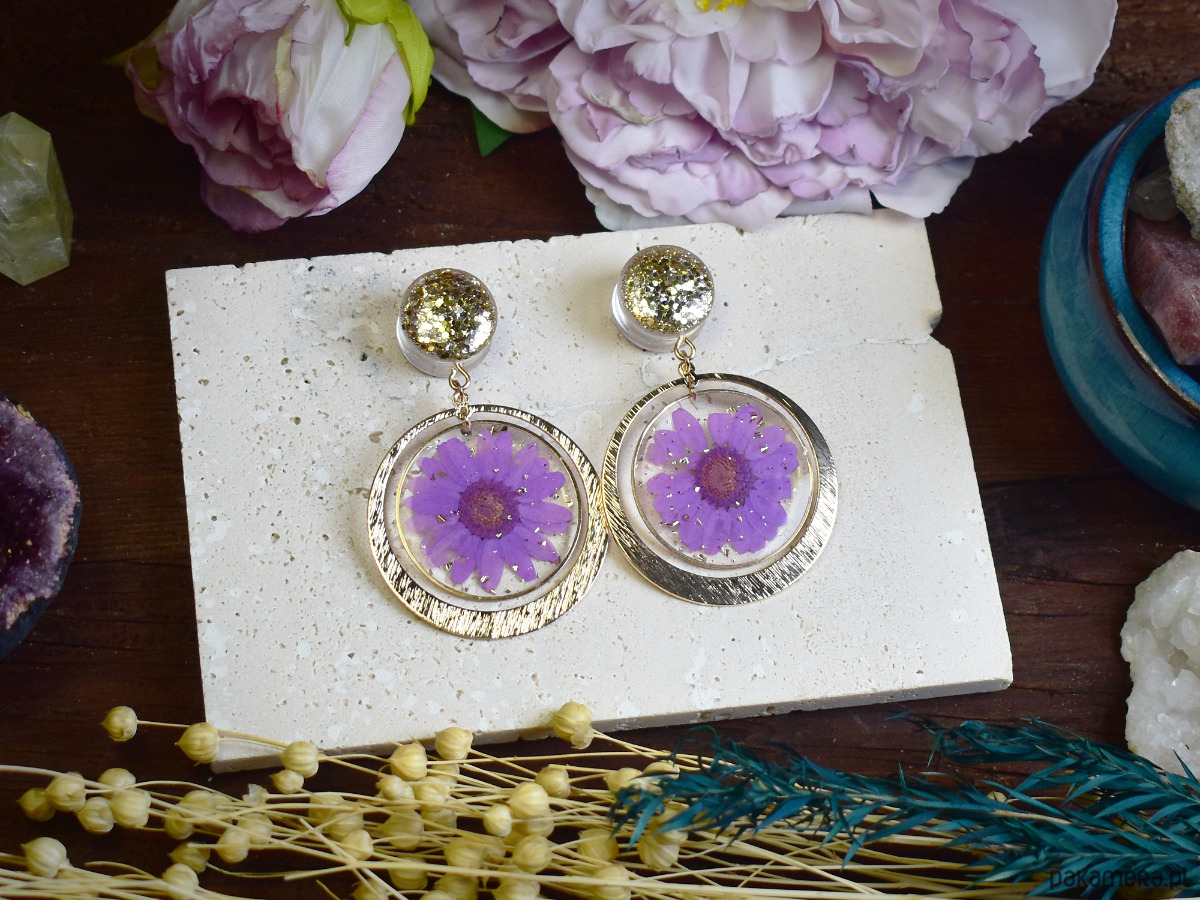 Ręcznie wykonane tunele do uszu z żywicy, w których zatopiono brokat z zawieszkami z kwiatów, tworzą naturalną i subtelną kompozycję. Każda para jest unikatowa, przywołując na myśl letnie łąki i bliskość natury. Zaleca się noszenie tuneli wyłącznie w wygojonych dziurkach, aby zapewnić komfort i ochronę skóry.