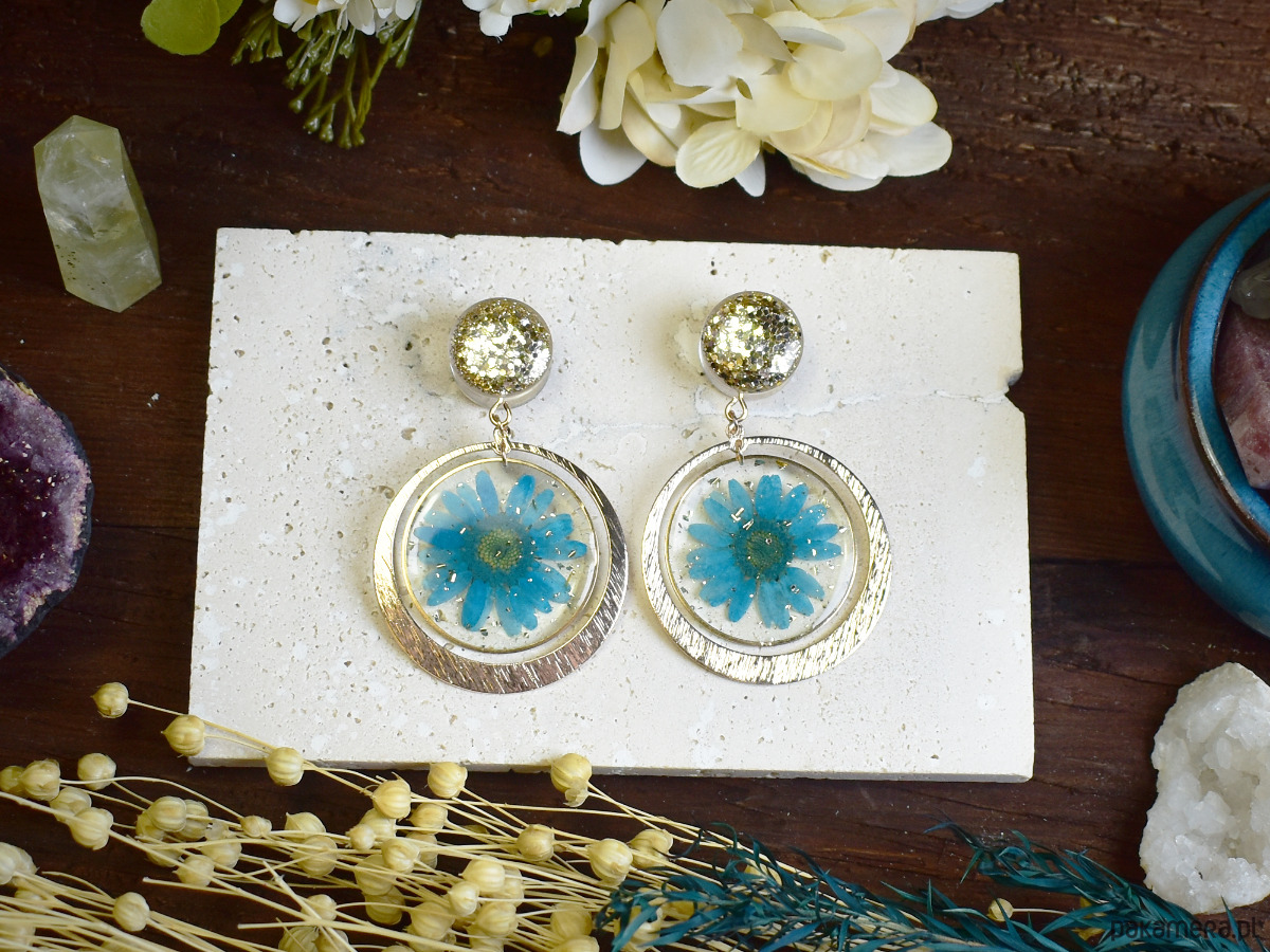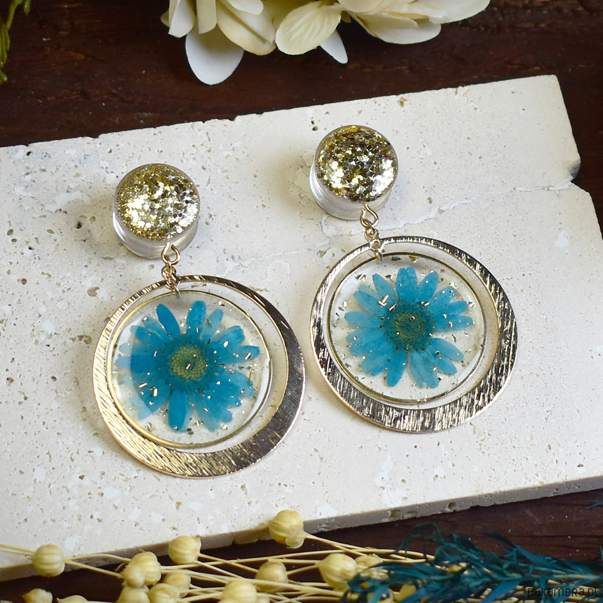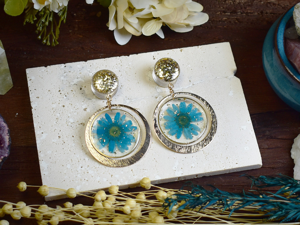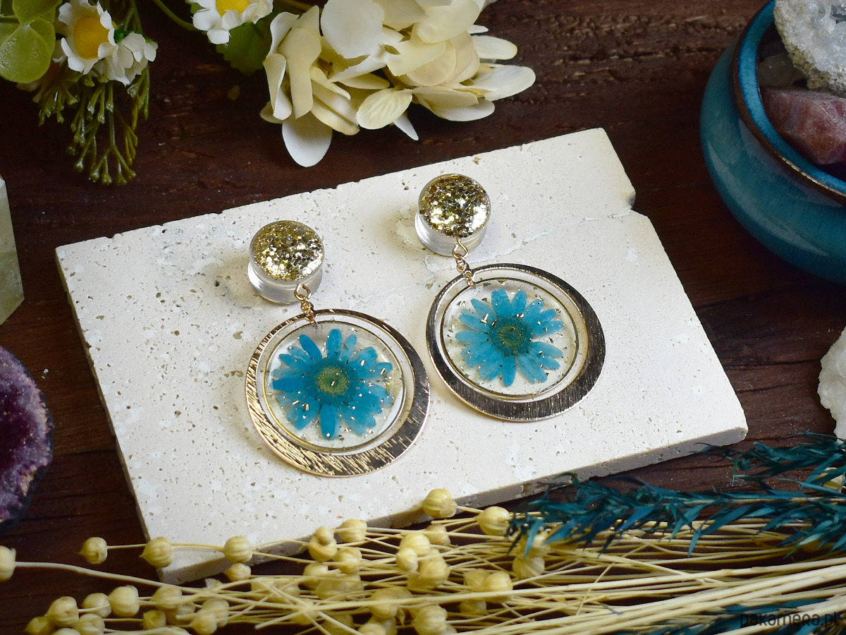 Ręcznie wykonane tunele do uszu z żywicy, w których zatopiono brokat z zawieszkami z kwiatów, tworzą naturalną i subtelną kompozycję. Każda para jest unikatowa, przywołując na myśl letnie łąki i bliskość natury. Zaleca się noszenie tuneli wyłącznie w wygojonych dziurkach, aby zapewnić komfort i ochronę skóry.