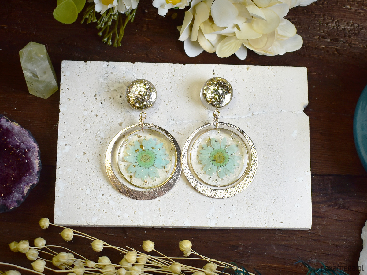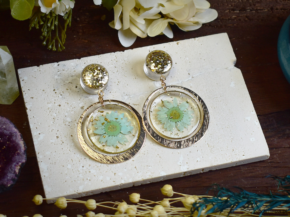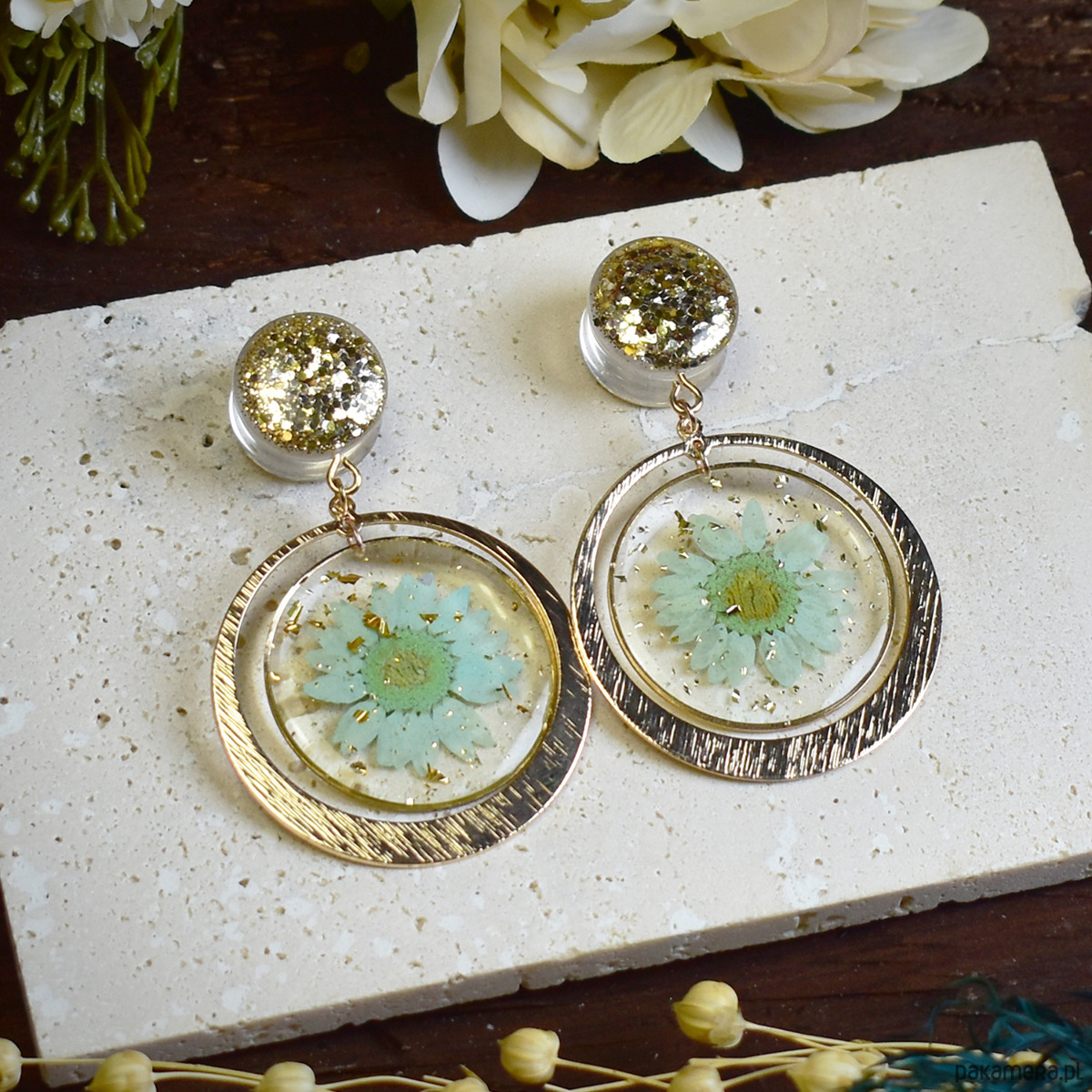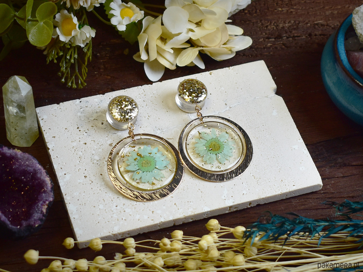 Ręcznie wykonane tunele do uszu z żywicy, w których zatopiono brokat z zawieszkami z kwiatów, tworzą naturalną i subtelną kompozycję. Każda para jest unikatowa, przywołując na myśl letnie łąki i bliskość natury. Zaleca się noszenie tuneli wyłącznie w wygojonych dziurkach, aby zapewnić komfort i ochronę skóry.