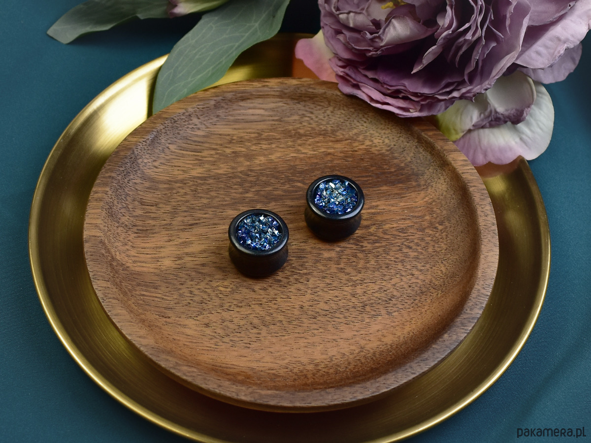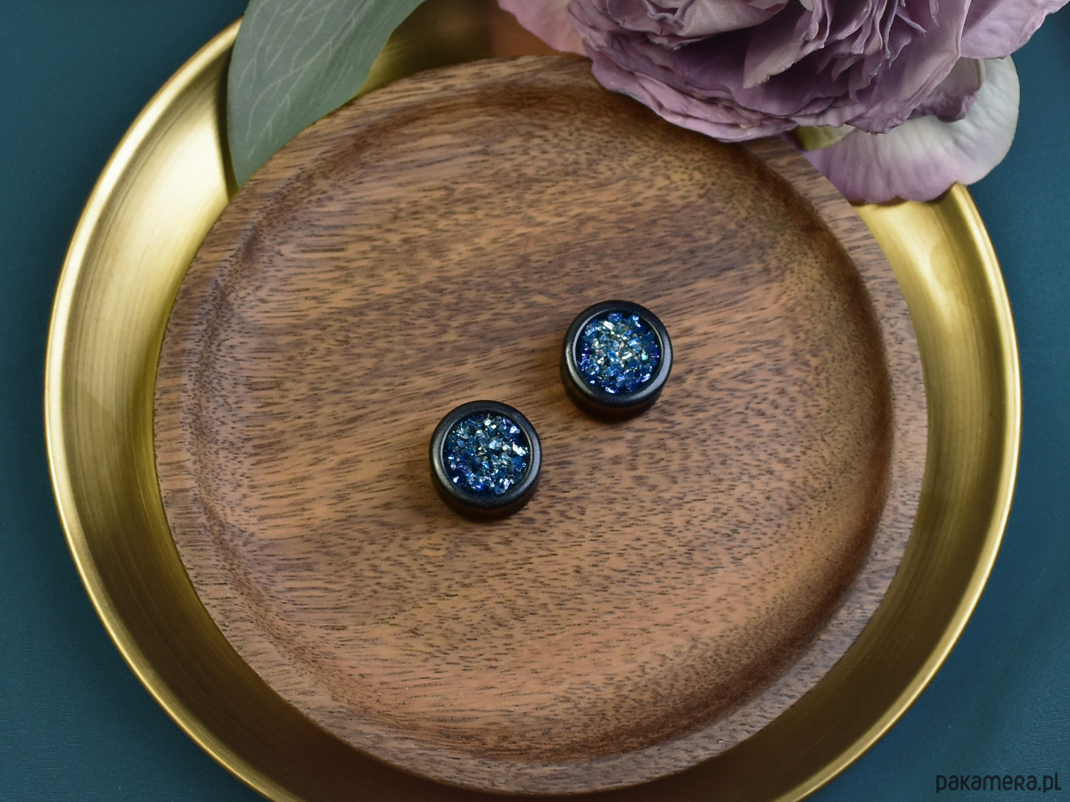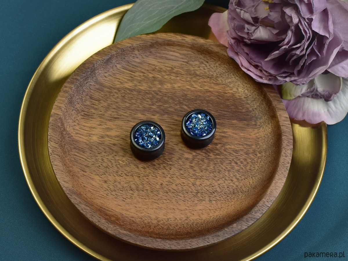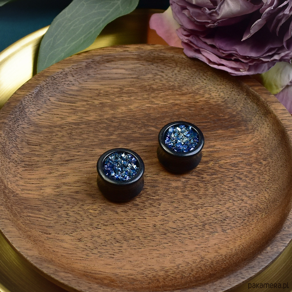 Ręcznie wykonane tunele/plugi siodłowe do uszu w rozmiarze 20mm. Tunele są wykonane z drobnym kruszonym szkłem, dzięki czemu wyglądają jak fragment geody.