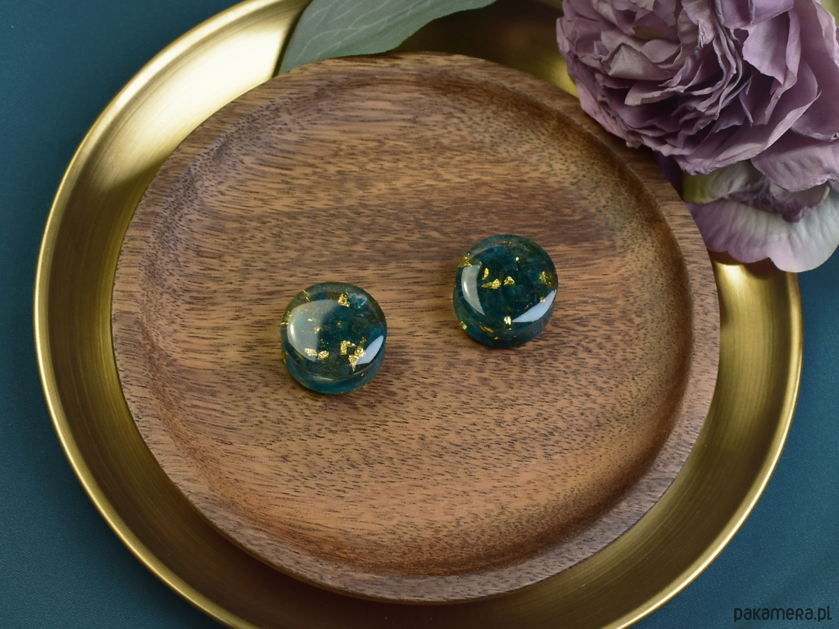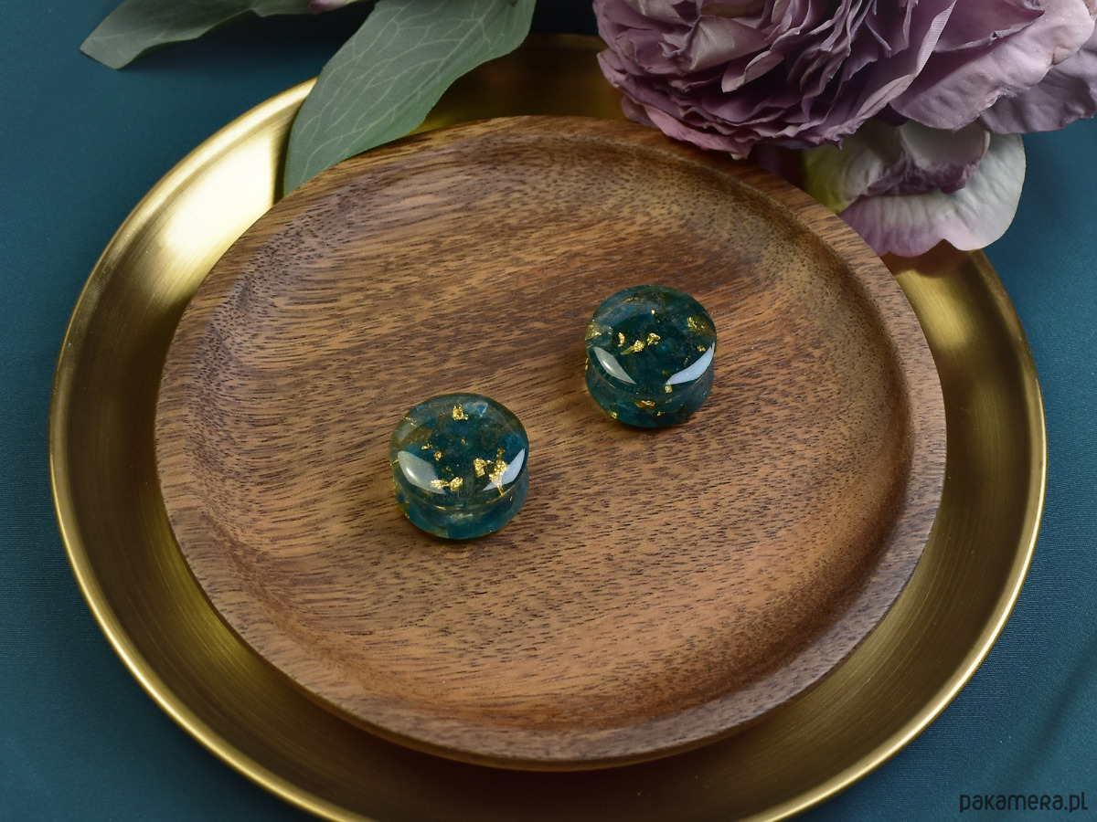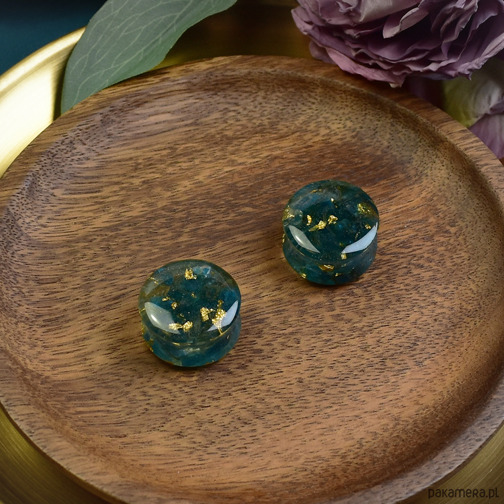Ręcznie wykonane tunele/plugi siodłowe do uszu w rozmiarze 24mm. Tunele są wykonane z drobnymi kamieniami apatytu z drobinkami złotej folii.