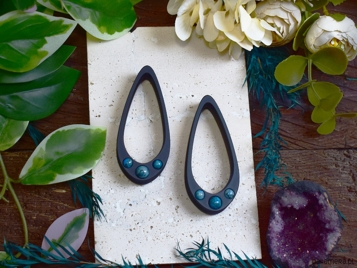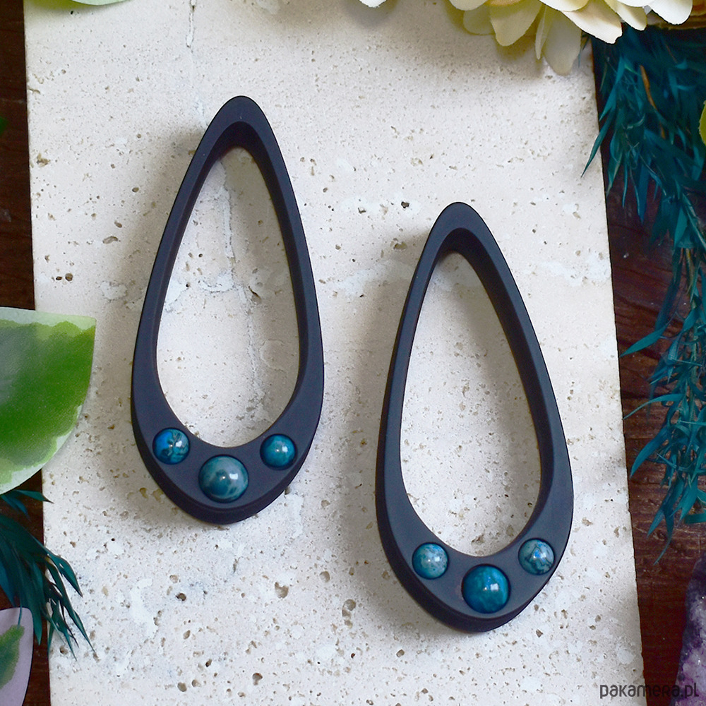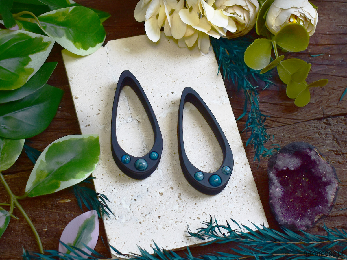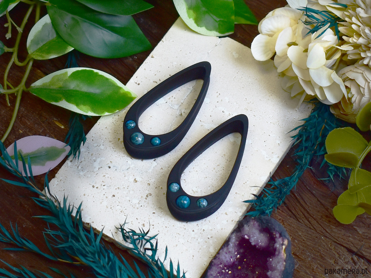 Tunele do uszu wykonane z biokompatybilnej żywicy, wykonane w technologii 3D, ręcznie wykonane i malowane. Bardzo lekkie i siodłowe, co sprawia, że nie wypadają z uszu. Idealne dla osób szukających wygodnych rozwiązań do noszenia na co dzień. Tunele mają mocno wydłużony kształt łezki w porównaniu do klasycznych łezek. Zawierają 3 kamienie dopasowane rozmiarem do rozmiaru tuneli. W małych tunelach kamienie będą znacznie mniejsze niż w większych.