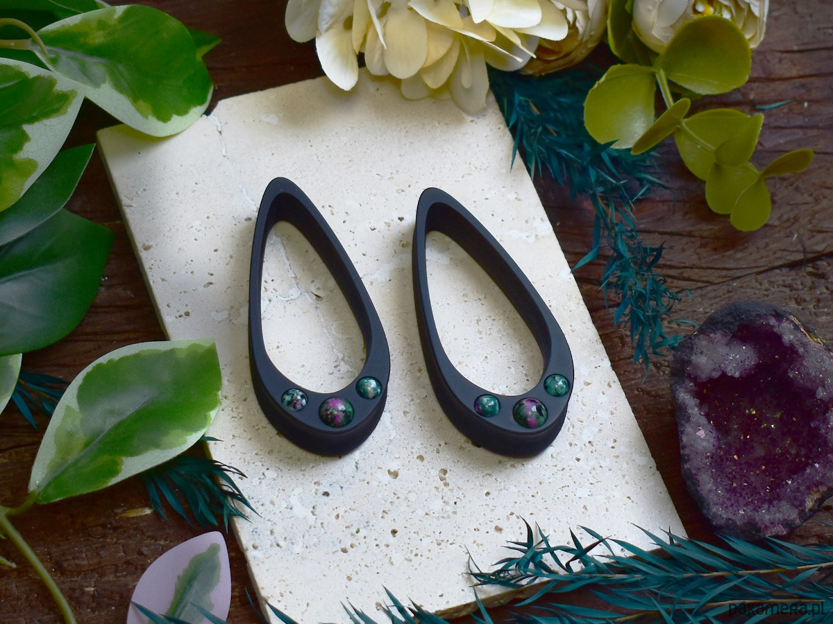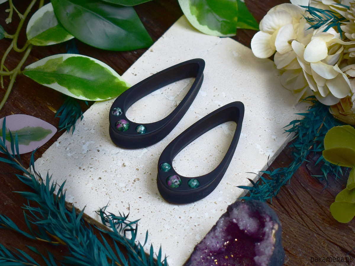 Tunele do uszu wykonane z biokompatybilnej żywicy, wykonane w technologii 3D, ręcznie wykonane i malowane. Bardzo lekkie i siodłowe, co sprawia, że nie wypadają z uszu. Idealne dla osób szukających wygodnych rozwiązań do noszenia na co dzień. Tunele mają mocno wydłużony kształt łezki w porównaniu do klasycznych łezek. Zawierają 3 kamienie dopasowane rozmiarem do rozmiaru tuneli. W małych tunelach kamienie będą znacznie mniejsze niż w większych.