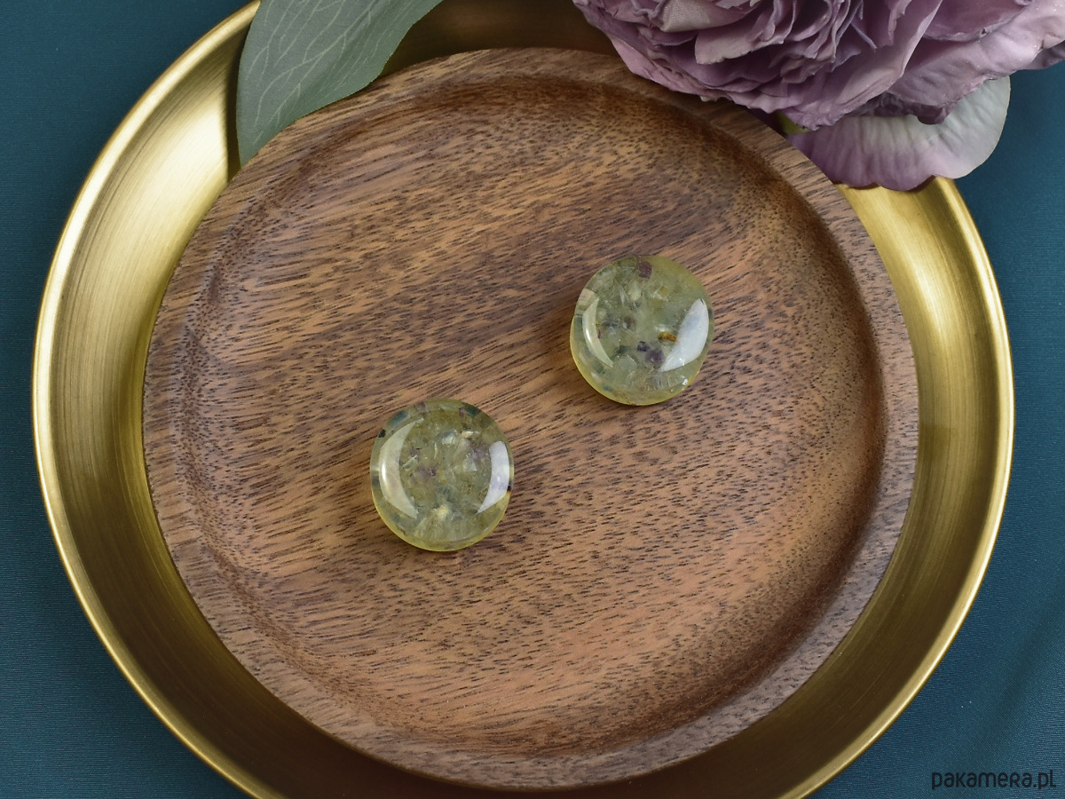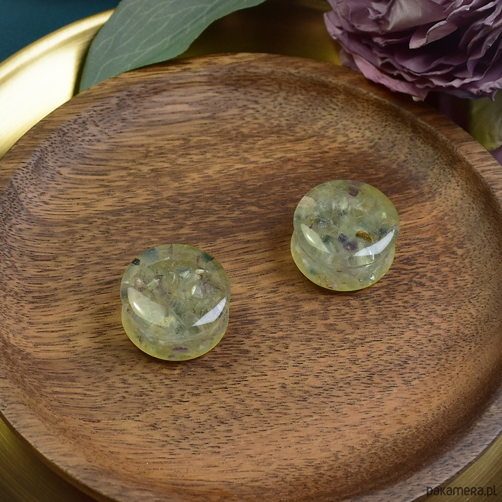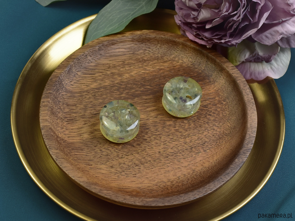 Ręcznie wykonane tunele/plugi siodłowe do uszu w rozmiarze 26mm. Tunele są wykonane z drobnymi kamieniami fluorytu.
