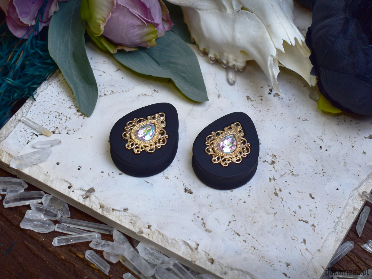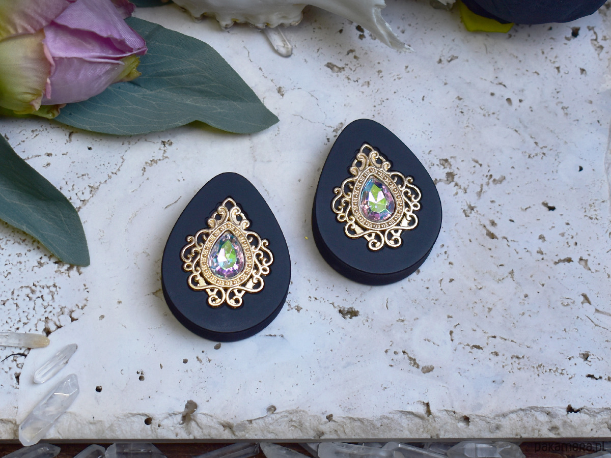 Tunele do uszu 34-60mm / łezki z wiktoriańską ozdobą i kryształkiem