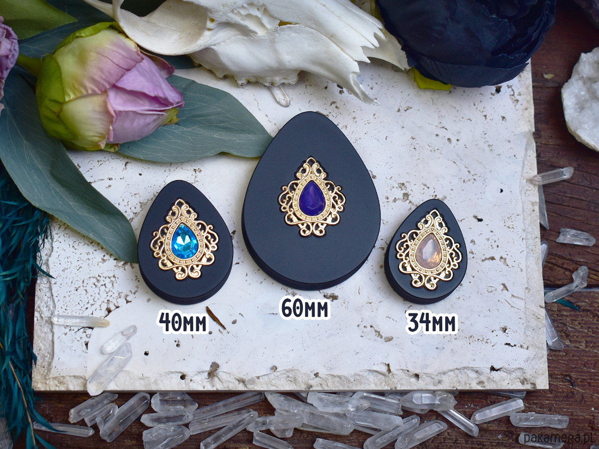 Tunele do uszu 34-60mm / łezki z wiktoriańską ozdobą i kryształkiem